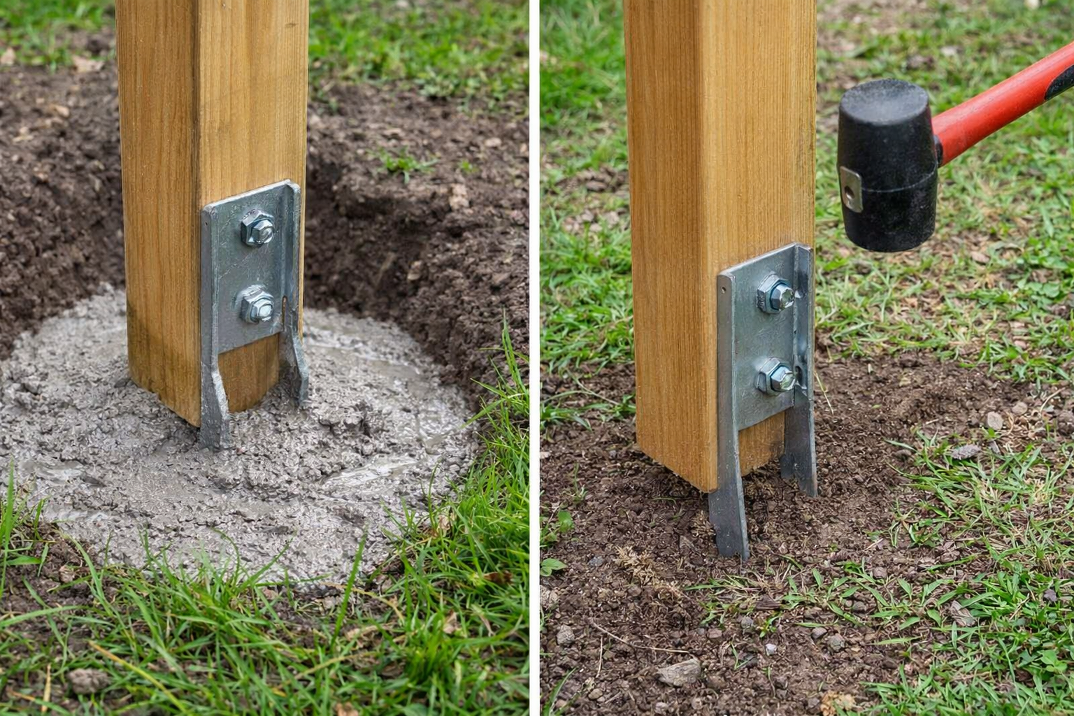 Eine bewährte Möglichkeit ist das Setzen von Metallankern neben den Holzfüßen des Spielturms. Diese Methode eignet sich besonders gut, wenn das Klettergerüst bereits aufgebaut ist.