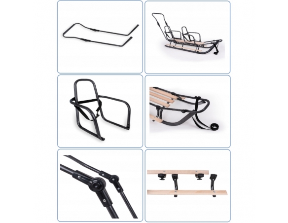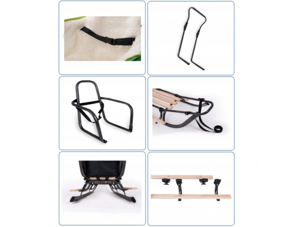 Die Rückenlehne ist mit einem Sicherheitsgurt ausgestattet, der mit einem Clip verschlossen wird. Der Schubbügel hat einen verstellbaren Griff für mehr Komfort. Nach der Demontage des zusätzlichen Zubehörs können die Schlitten weiterhin genutzt werden, wenn die Kinder größer sind.