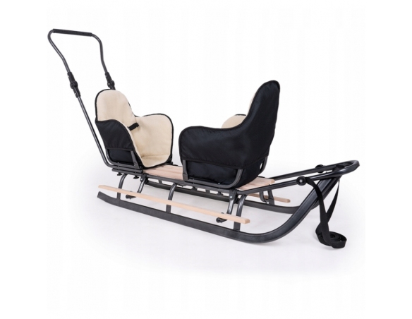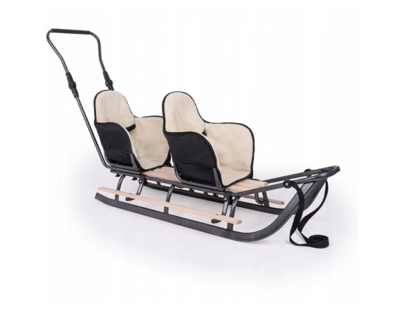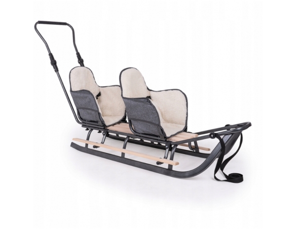 Multifunktionale Doppelschlitten ausgestattet mit Schubbügel, warme und weiche Sitzkissen aus Fleece und Fußablagen.