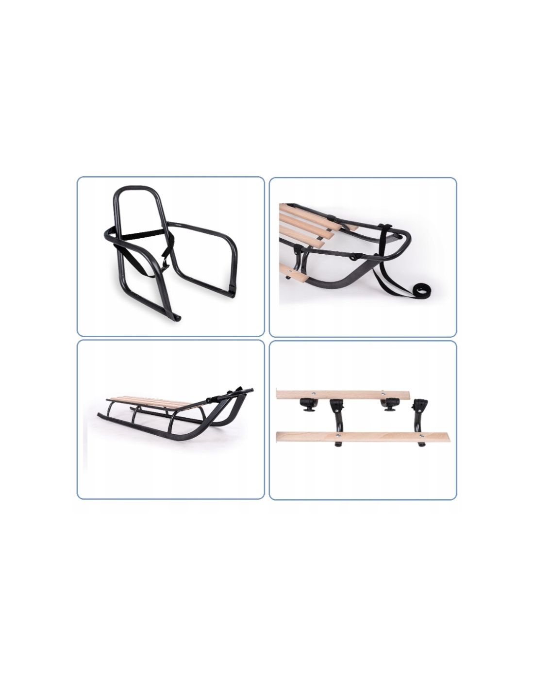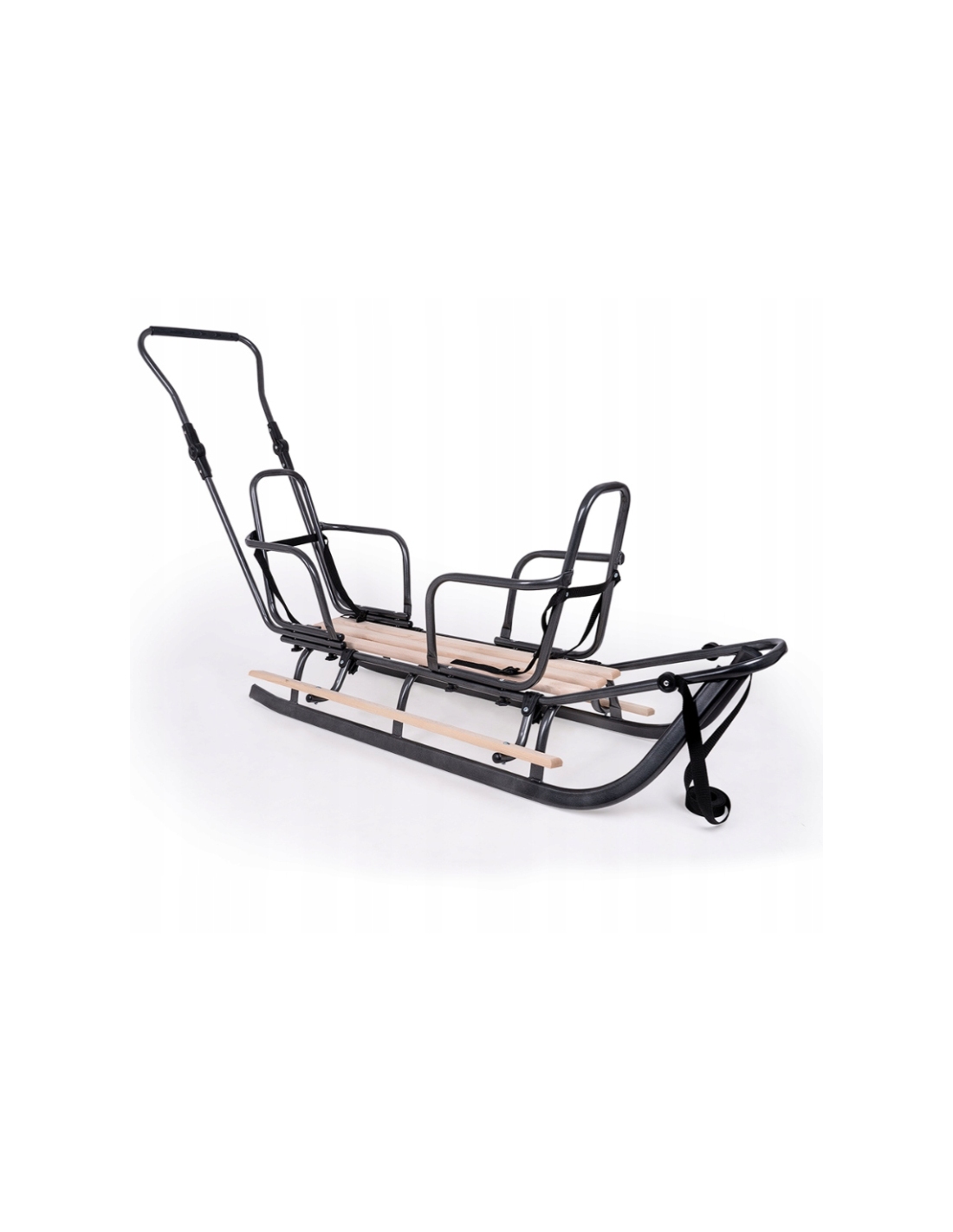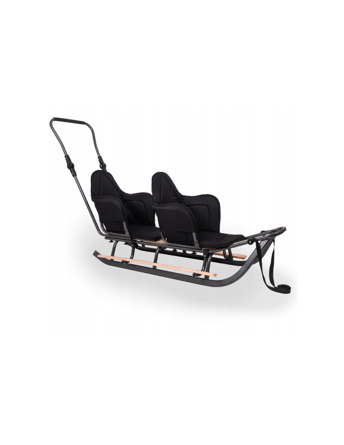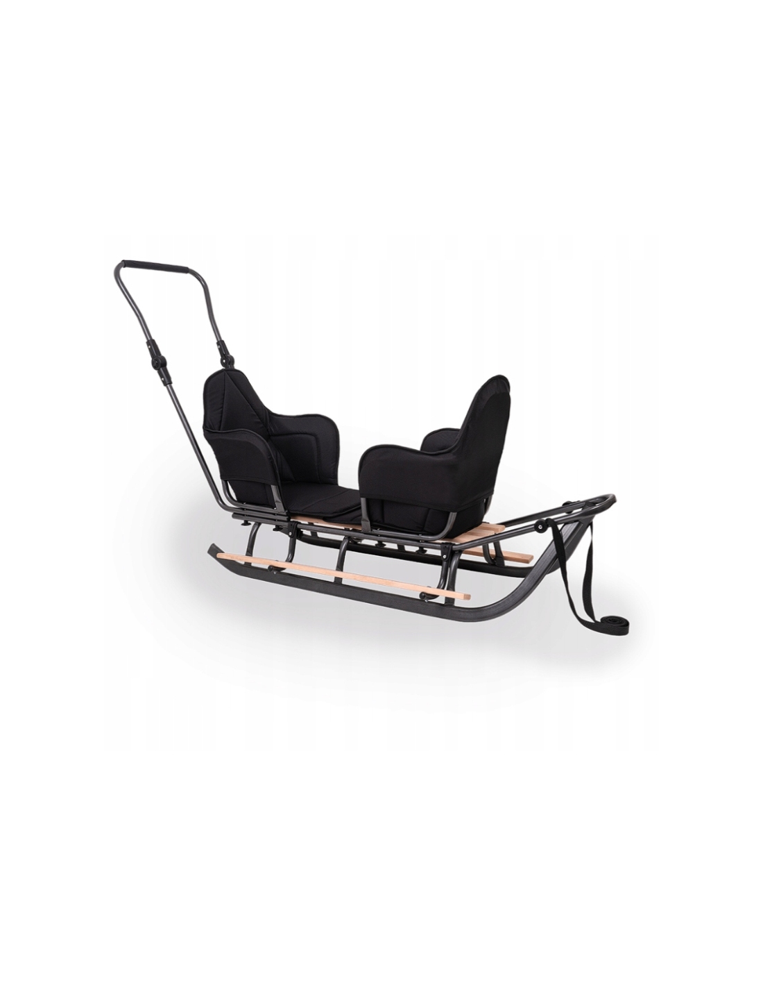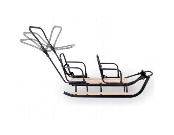 Die Rückenlehne ist mit einem Sicherheitsgurt ausgestattet, der mit einem Clip verschlossen wird. Der Schubbügel hat einen verstellbaren Griff für mehr Komfort. Nach der Demontage des zusätzlichen Zubehörs können die Schlitten weiterhin genutzt werden, wenn die Kinder größer sind.