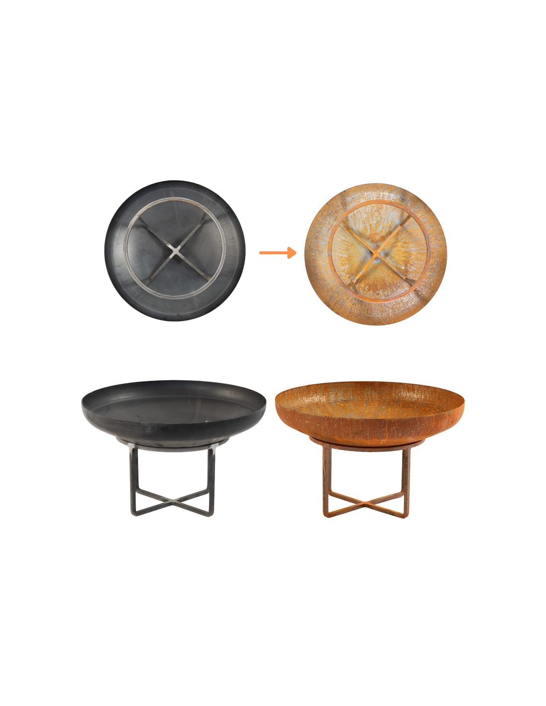 Wie auf dem Bild gezeigt, wird die Feuerschale im Urzustand aus unbehandeltem, unbemaltem Stahl geliefert – sie ist zu Beginn nicht rostig. Erst nach einigen Wochen oder Monaten setzt durch den natürlichen Rostprozess eine edle, rötlich-braune Patina an. Dieser Effekt ist bewusst gewollt und entspricht den neuesten Trends in der Gartengestaltung. Die rostige Oberfläche verleiht der Feuerschale einen besonderen industriellen Charme und sorgt für ein einzigartiges Design, das perfekt zu modernen wie auch rustikalen Außenbereichen passt.