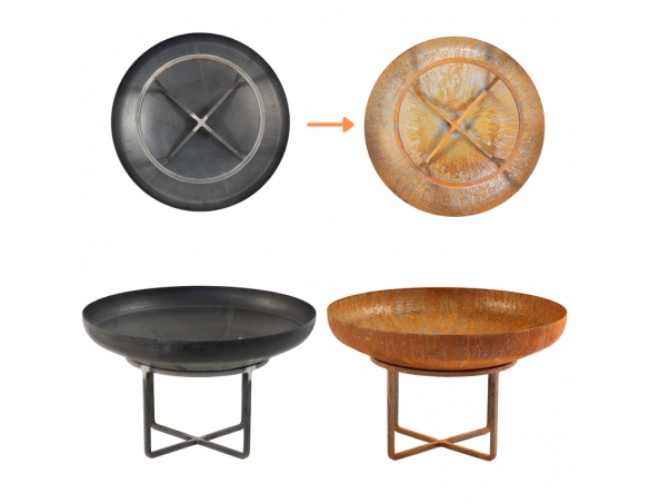 Wie auf dem Bild gezeigt, wird die Feuerschale im Urzustand aus unbehandeltem, unbemaltem Stahl geliefert – sie ist zu Beginn nicht rostig. Erst nach einigen Wochen oder Monaten setzt durch den natürlichen Rostprozess eine edle, rötlich-braune Patina an. Dieser Effekt ist bewusst gewollt und entspricht den neuesten Trends in der Gartengestaltung. Die rostige Oberfläche verleiht der Feuerschale einen besonderen industriellen Charme und sorgt für ein einzigartiges Design, das perfekt zu modernen wie auch rustikalen Außenbereichen passt.