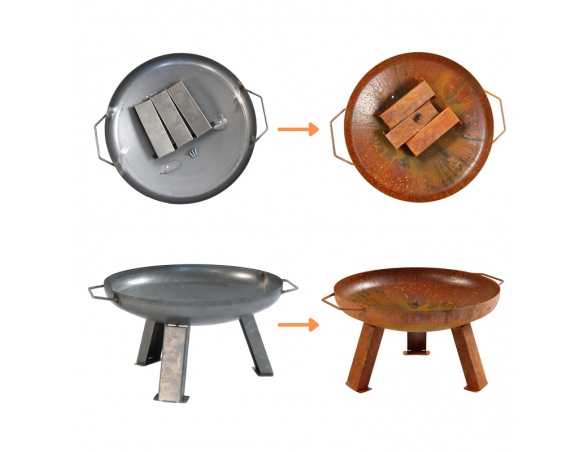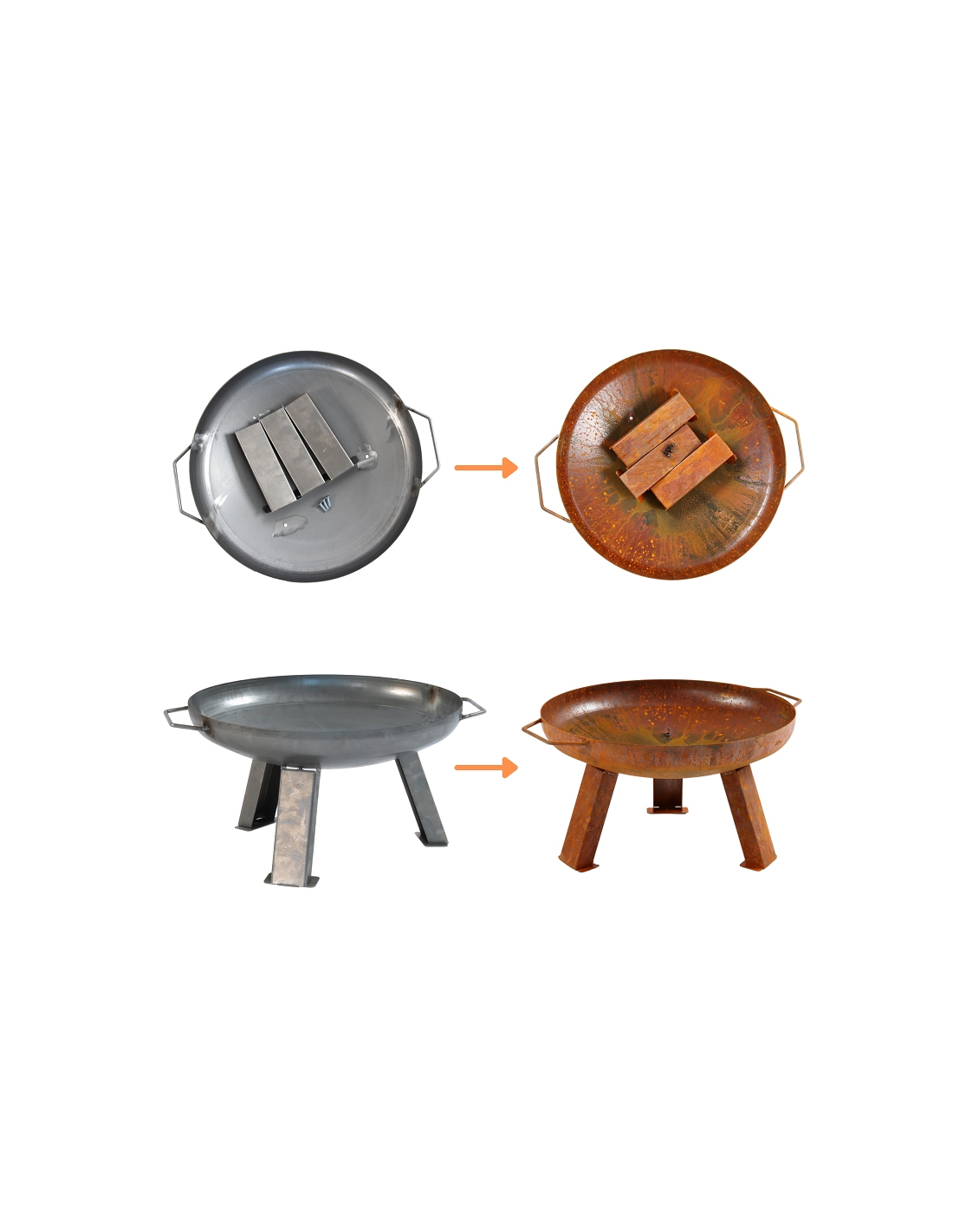 Wie auf dem Bild gezeigt, wird die Feuerschale im Urzustand aus unbehandeltem, unbemaltem Stahl geliefert – sie ist zu Beginn nicht rostig. Erst nach einigen Wochen oder Monaten setzt durch den natürlichen Rostprozess eine edle, rötlich-braune Patina an. Dieser Effekt ist bewusst gewollt und entspricht den neuesten Trends in der Gartengestaltung. Die rostige Oberfläche verleiht der Feuerschale einen besonderen industriellen Charme und sorgt für ein einzigartiges Design, das perfekt zu modernen wie auch rustikalen Außenbereichen passt.
