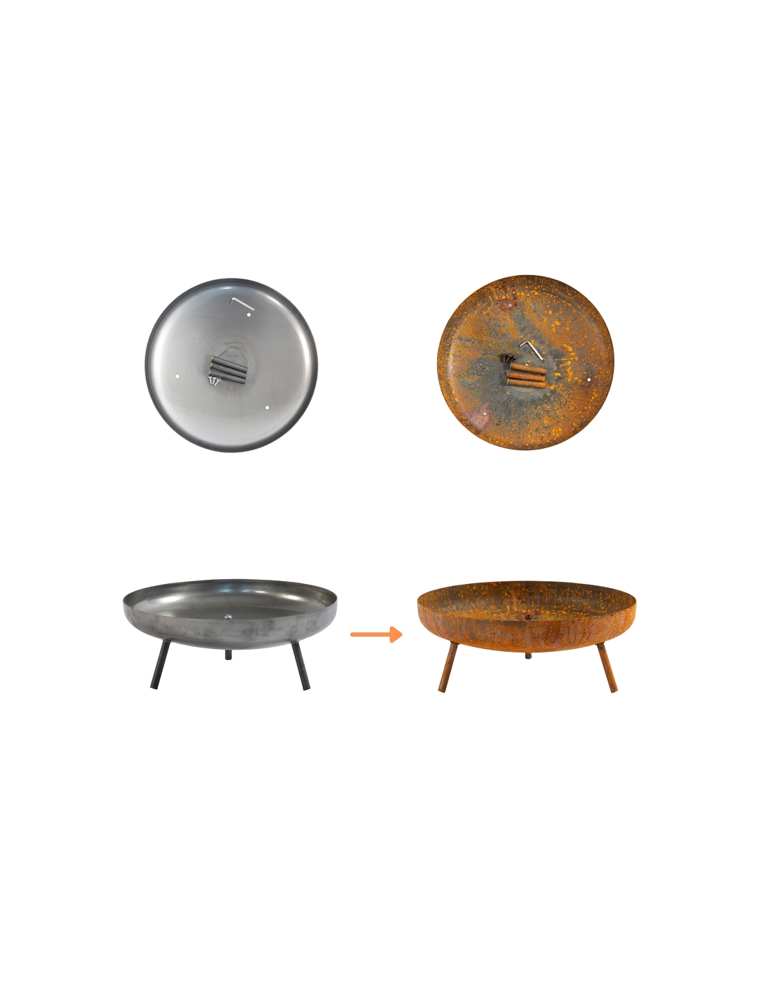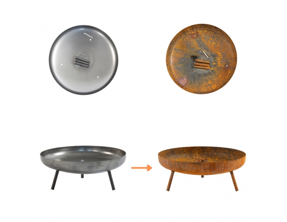 Wie auf dem Bild gezeigt, wird die Feuerschale im Urzustand aus unbehandeltem, unbemaltem Stahl geliefert – sie ist zu Beginn nicht rostig. Erst nach einigen Wochen oder Monaten setzt durch den natürlichen Rostprozess eine edle, rötlich-braune Patina an. Dieser Effekt ist bewusst gewollt und entspricht den neuesten Trends in der Gartengestaltung. Die rostige Oberfläche verleiht der Feuerschale einen besonderen industriellen Charme und sorgt für ein einzigartiges Design, das perfekt zu modernen wie auch rustikalen Außenbereichen passt.