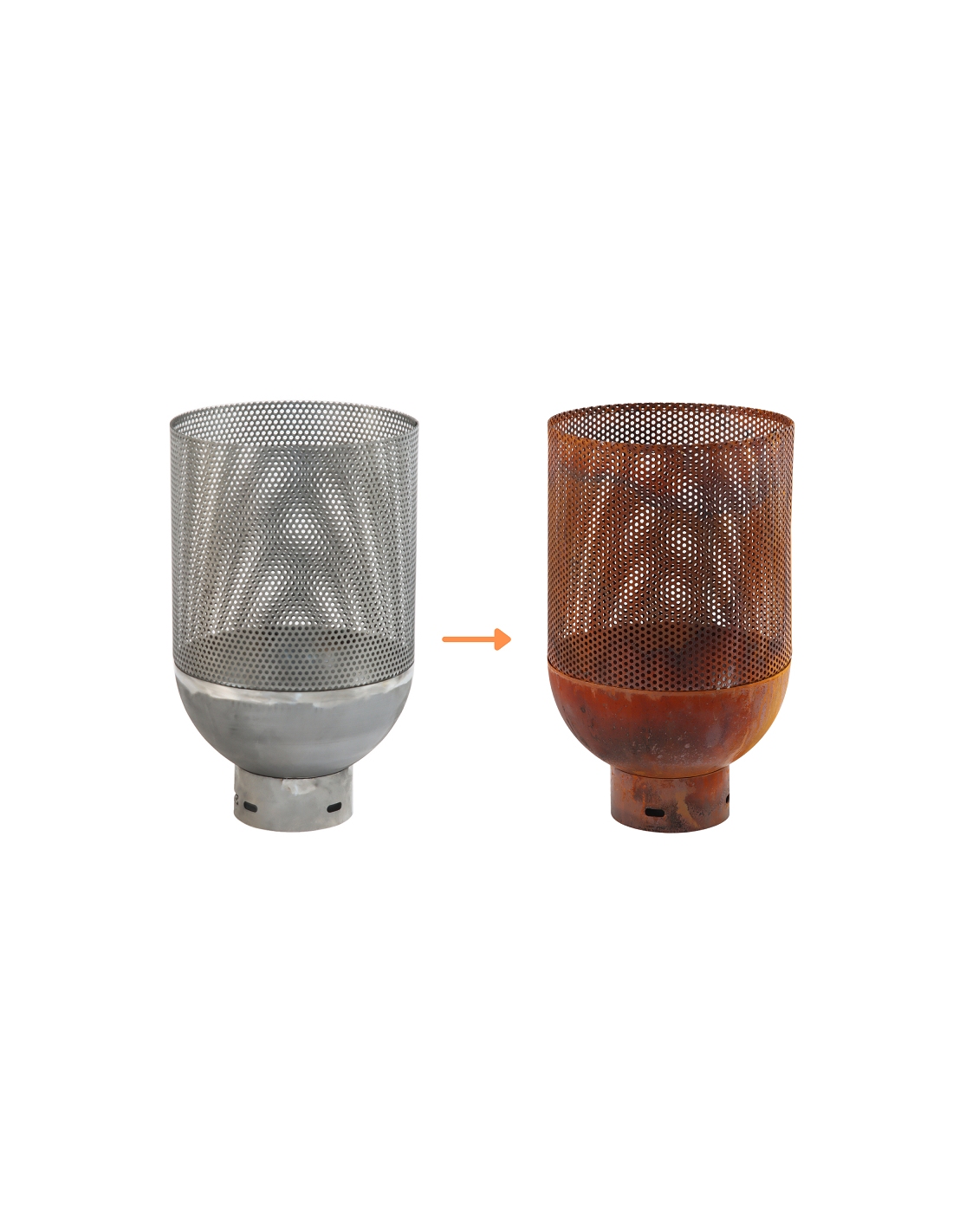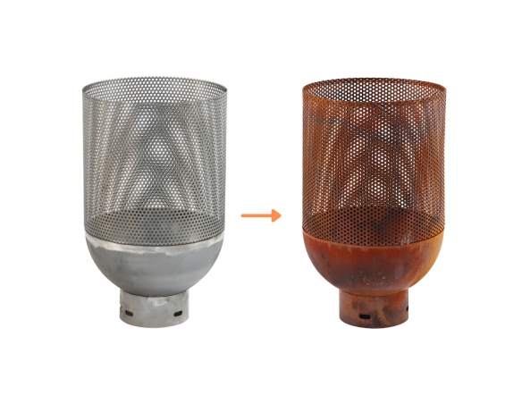 Wie auf dem Bild gezeigt, wird die Feuerschale im Urzustand aus unbehandeltem, unbemaltem Stahl geliefert – sie ist zu Beginn nicht rostig. Erst nach einigen Wochen oder Monaten setzt durch den natürlichen Rostprozess eine edle, rötlich-braune Patina an. Dieser Effekt ist bewusst gewollt und entspricht den neuesten Trends in der Gartengestaltung. Die rostige Oberfläche verleiht der Feuerschale einen besonderen industriellen Charme und sorgt für ein einzigartiges Design, das perfekt zu modernen wie auch rustikalen Außenbereichen passt.