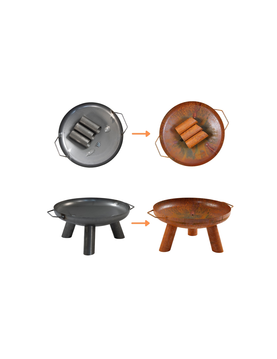 Wie auf dem Bild gezeigt, wird die Feuerschale im Urzustand aus unbehandeltem, unbemaltem Stahl geliefert – sie ist zu Beginn nicht rostig. Erst nach einigen Wochen oder Monaten setzt durch den natürlichen Rostprozess eine edle, rötlich-braune Patina an. Dieser Effekt ist bewusst gewollt und entspricht den neuesten Trends in der Gartengestaltung. Die rostige Oberfläche verleiht der Feuerschale einen besonderen industriellen Charme und sorgt für ein einzigartiges Design, das perfekt zu modernen wie auch rustikalen Außenbereichen passt.