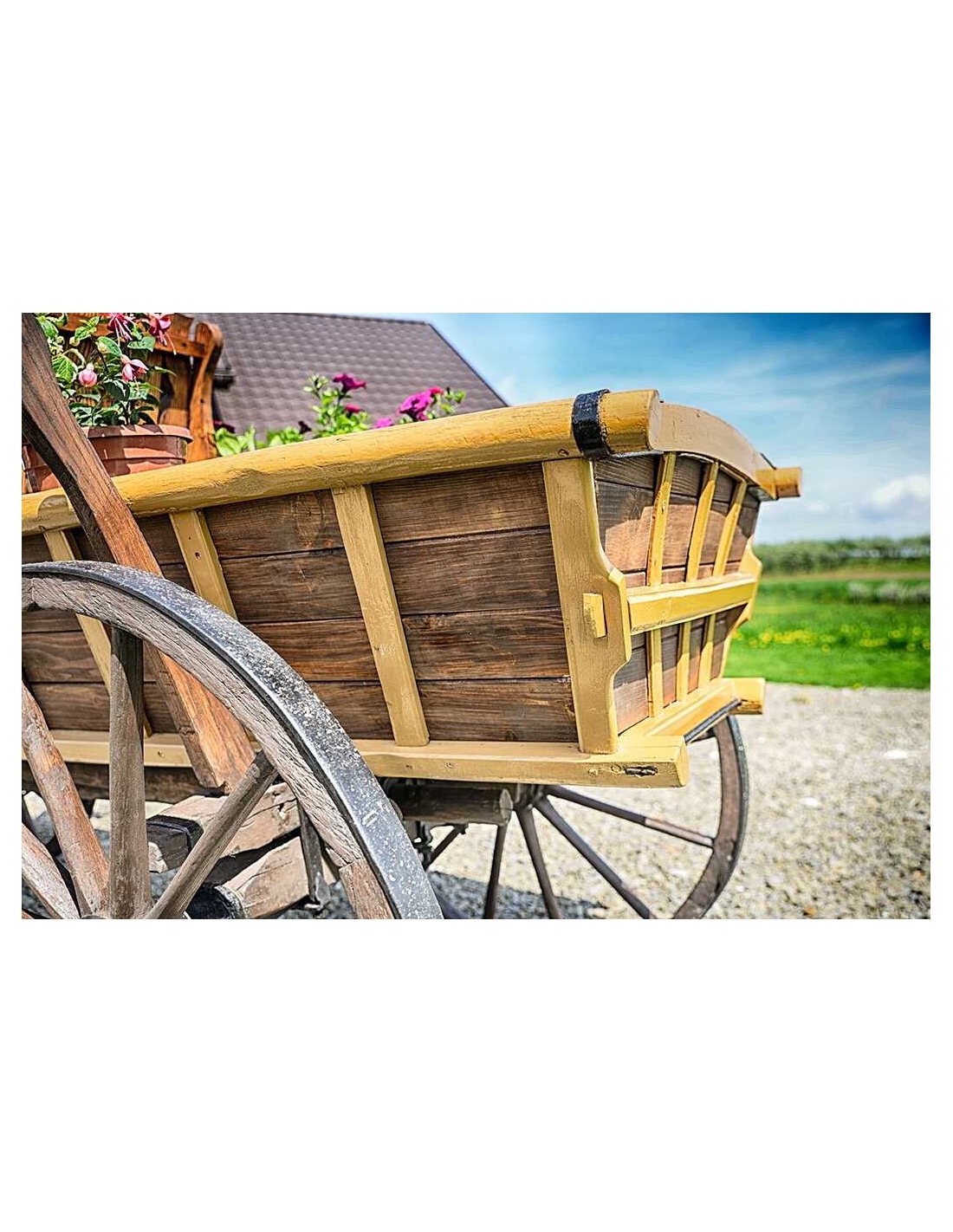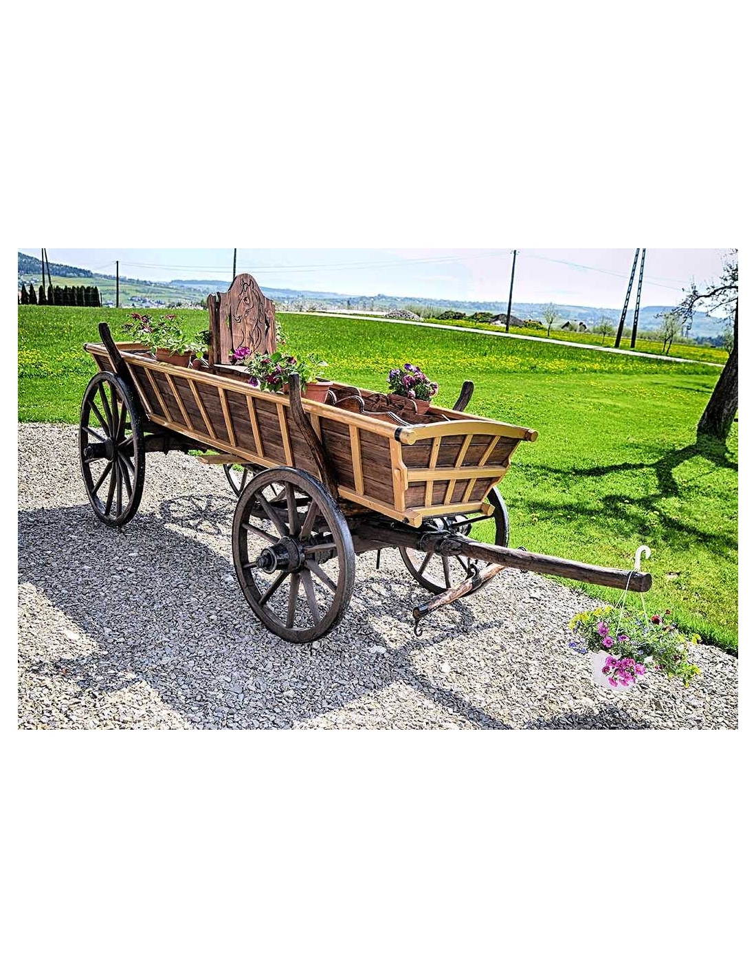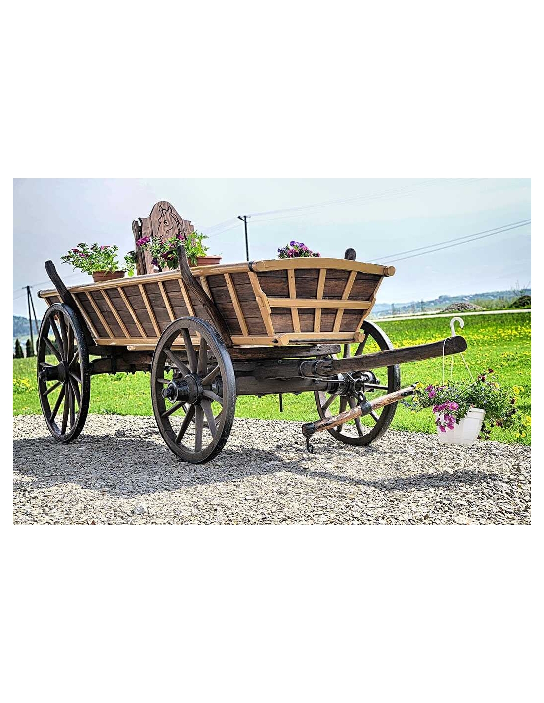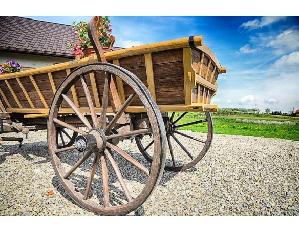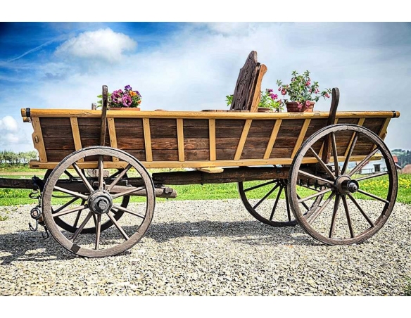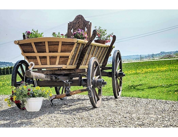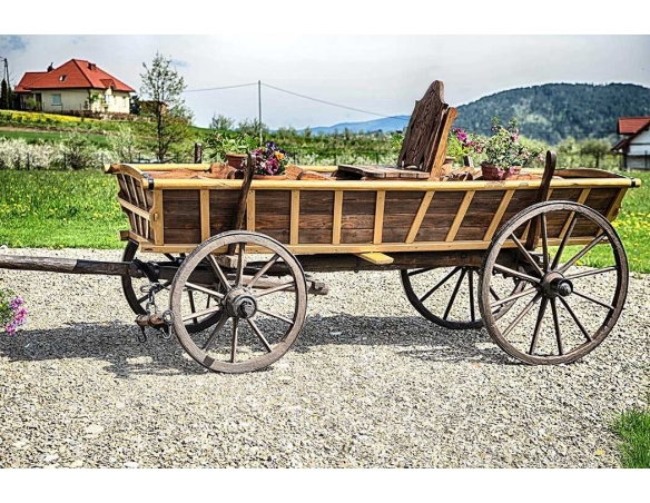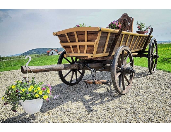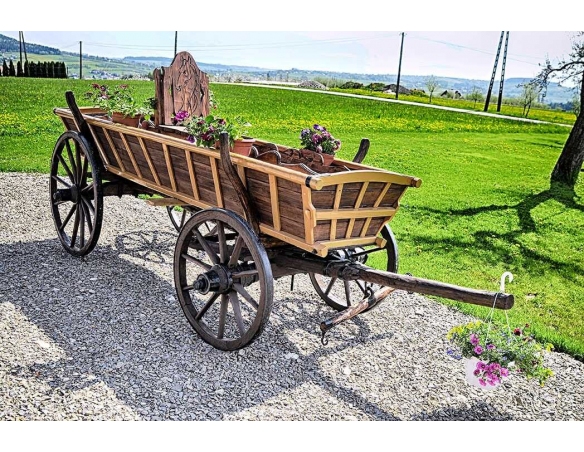 Alter Fuhrwerk / Leiterwagen / Heuwagen nach Renovierung. 1:1 Pferdefuhrwerk in Originalgröße. Perfekt als Gartendekoration, inklusive Blumenbeeten zum Pflanzen von Blumen. Jedes Fuhrwerk ist ein Unikat, sie werden aus den ältesten Dörfern der Masuren, Kaschubien und Bergregionen Polens, Tschechiens und der Slowakei importiert.