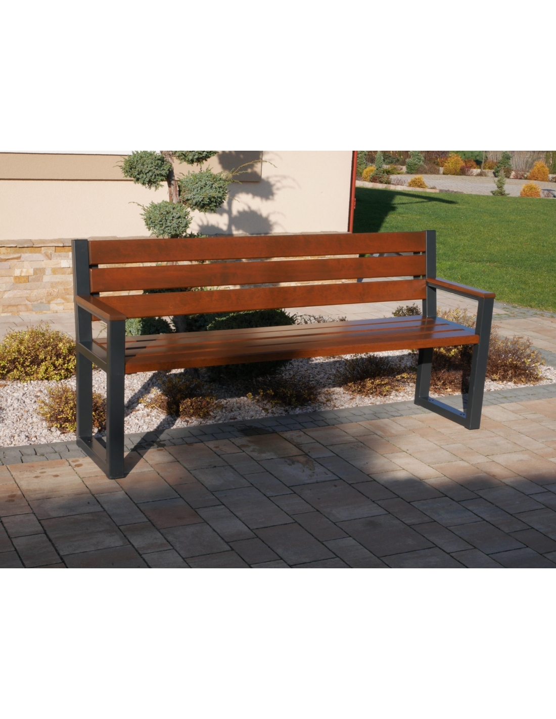 Die moderne Bank passt zu den neuesten Trends der Gartenarchitektur.