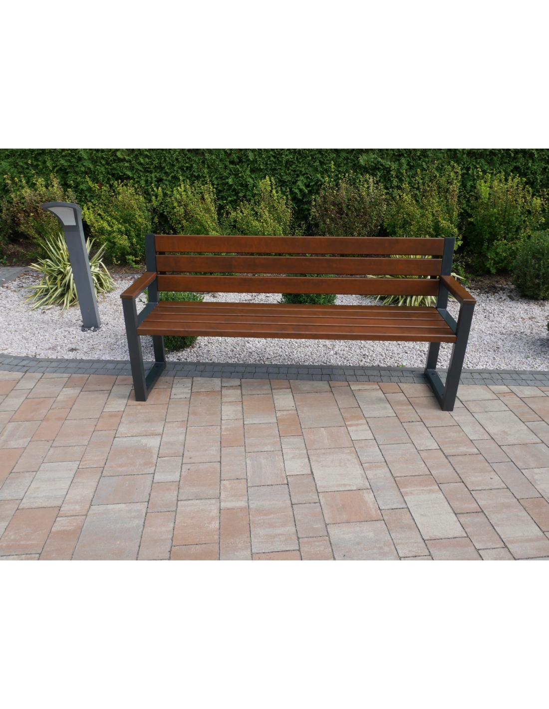 Klassische, einfache und langlebige Stadt- und Parkbank. Hergestellt aus Stahl- und Holzelementen. Modernes Design lässt die Bank in öffentlichen Bereichen gut aussehen.