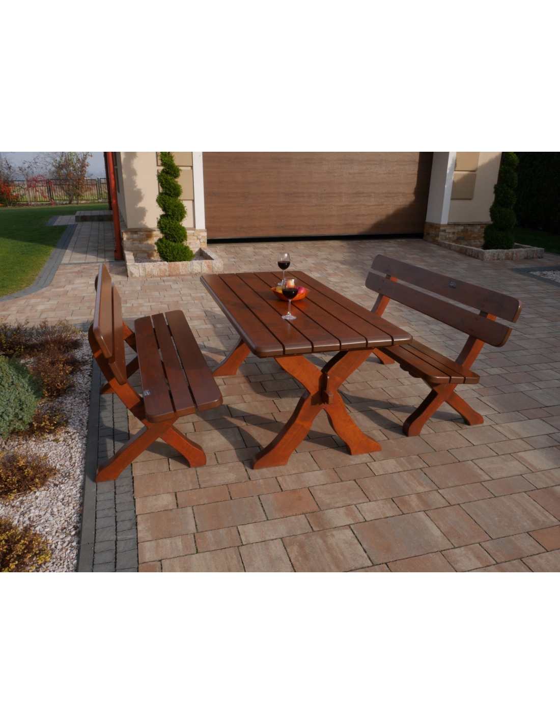 Dieses Set enthält einen Tisch, zwei Bänke und zwei Stühle mit Rückenlehne, ohne Armlehnen..