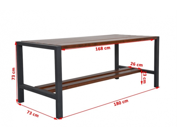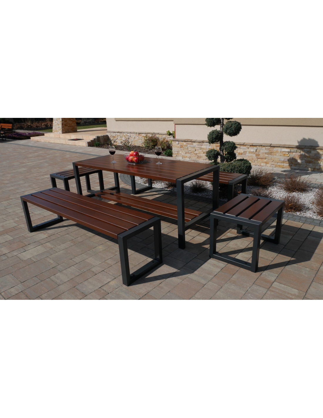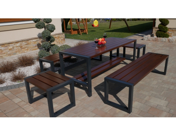 Dieses Set enthält einen Tisch, zwei Bänke und zwei Stühle ohne Rückenlehne und Armlehnen.
