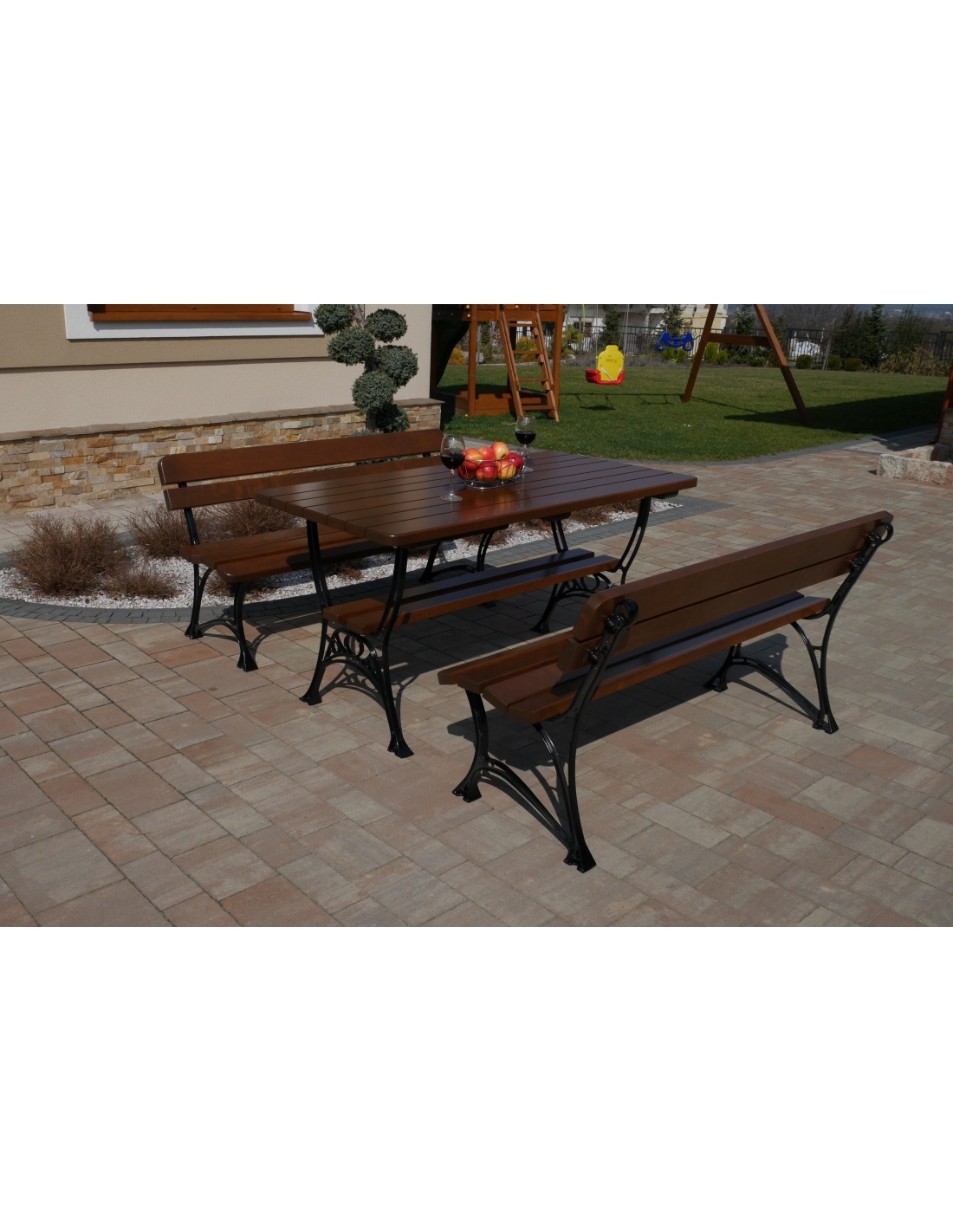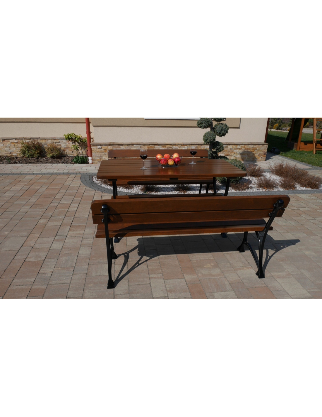 Dieses Set enthält einen Tisch und zwei Bänke mit Rückenlehne, ohne Armlehnen.