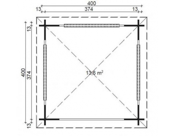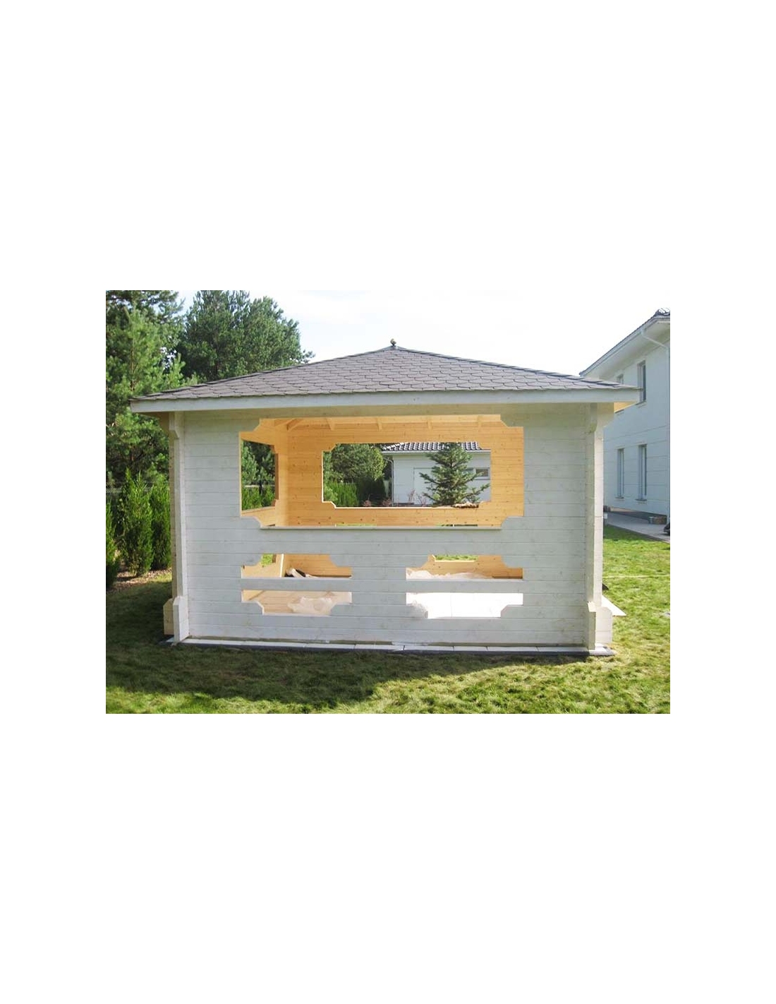 Die Länge und Breite des Ibiza-Pavillons, exklusive der herausragenden Bauelemente, beträgt 380×380 cm und bietet eine Nutzfläche von ca. 14,5 m2. Die Laube ist aus massivem 45-mm-Fichtenholzbalken gefertigt.