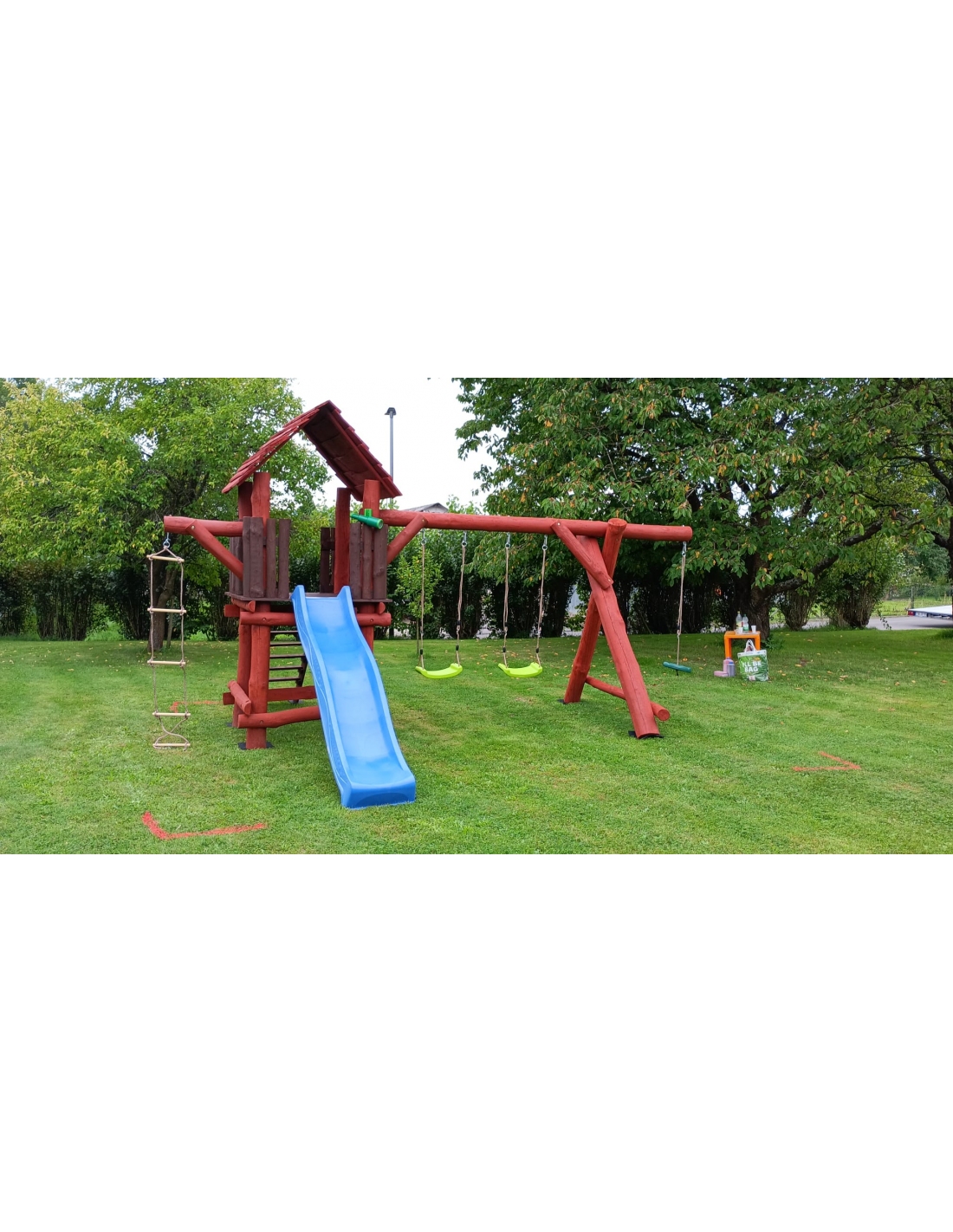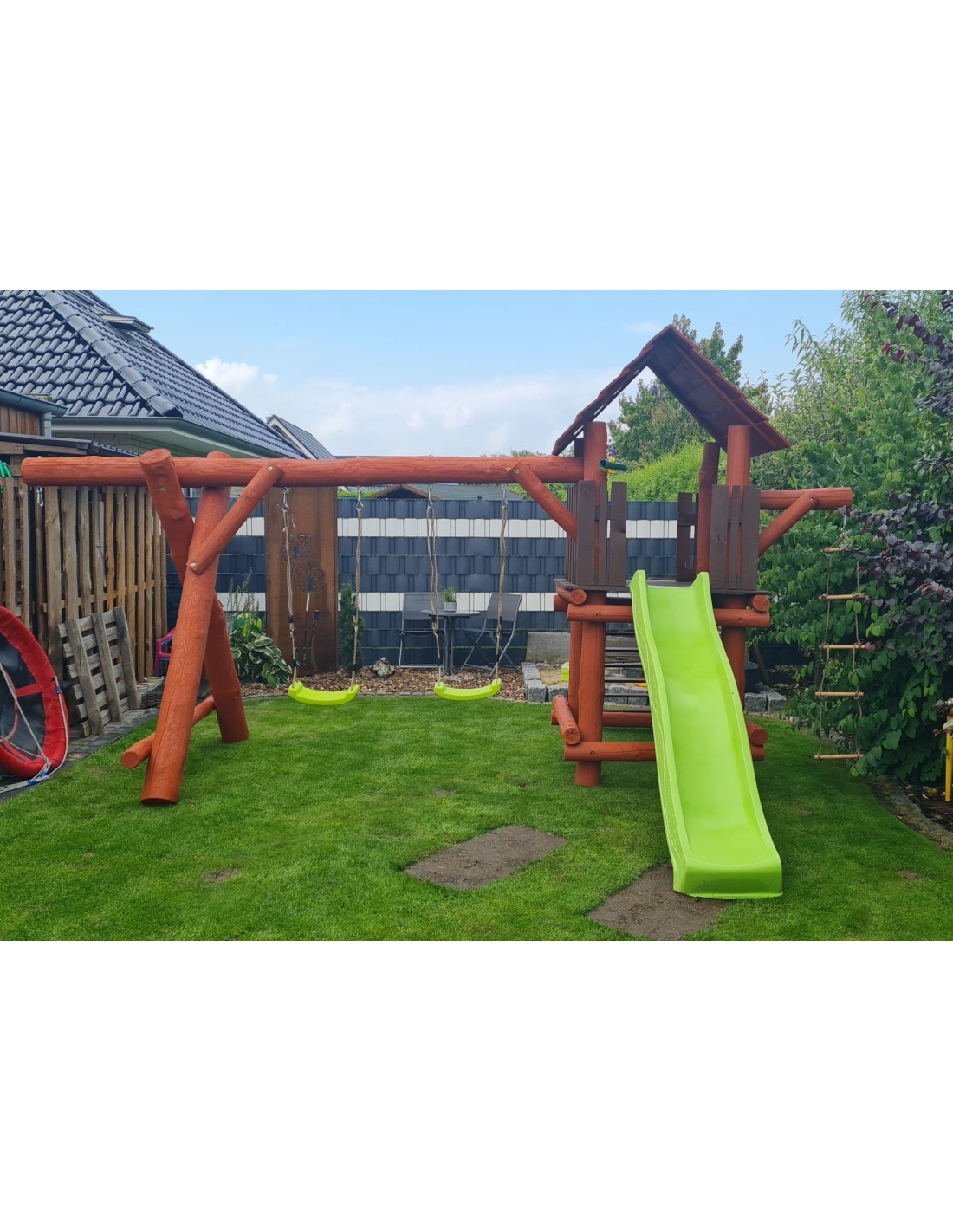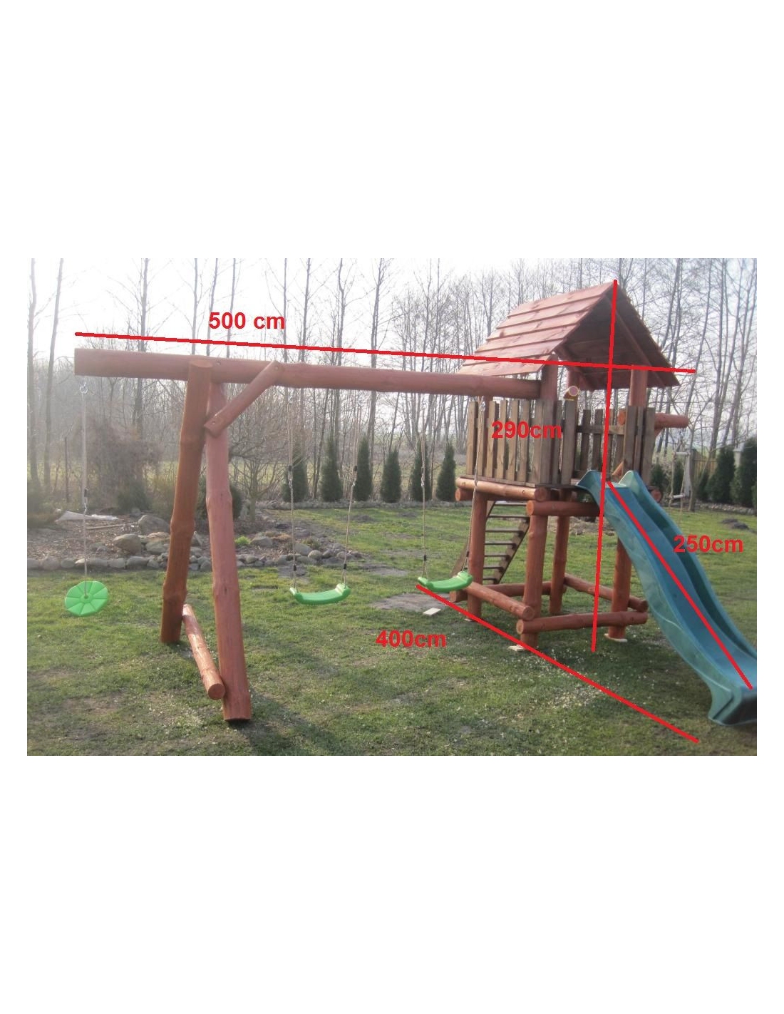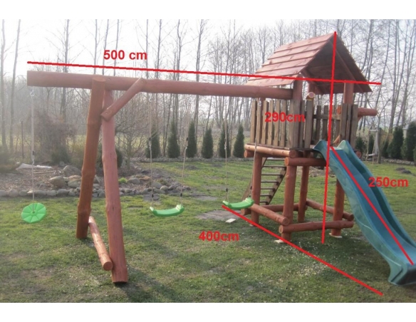 - (LxBxH): 500 cm x 400 cm x 290 cm - (Die Gesamtabmessungen können eine Toleranz von etwa 20–30 cm aufweisen. Die Maße hängen von der Dicke der Balken ab, aus denen wir die Spieltürme herstellen. Die Balken haben eine natürliche, unregelmäßige Form)