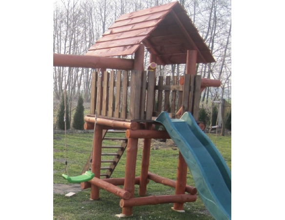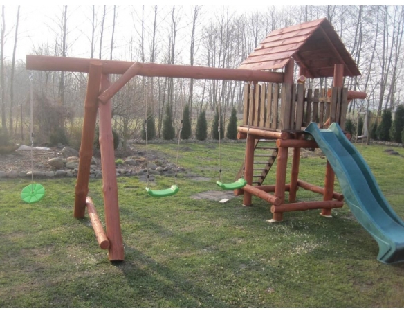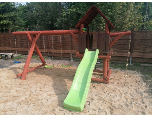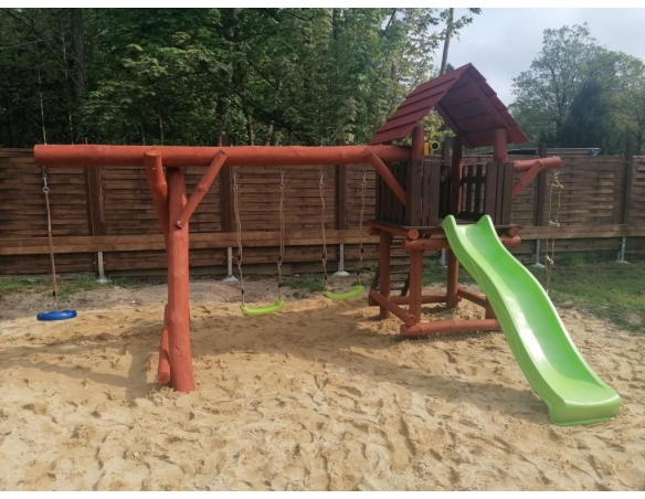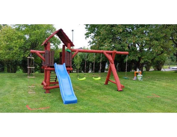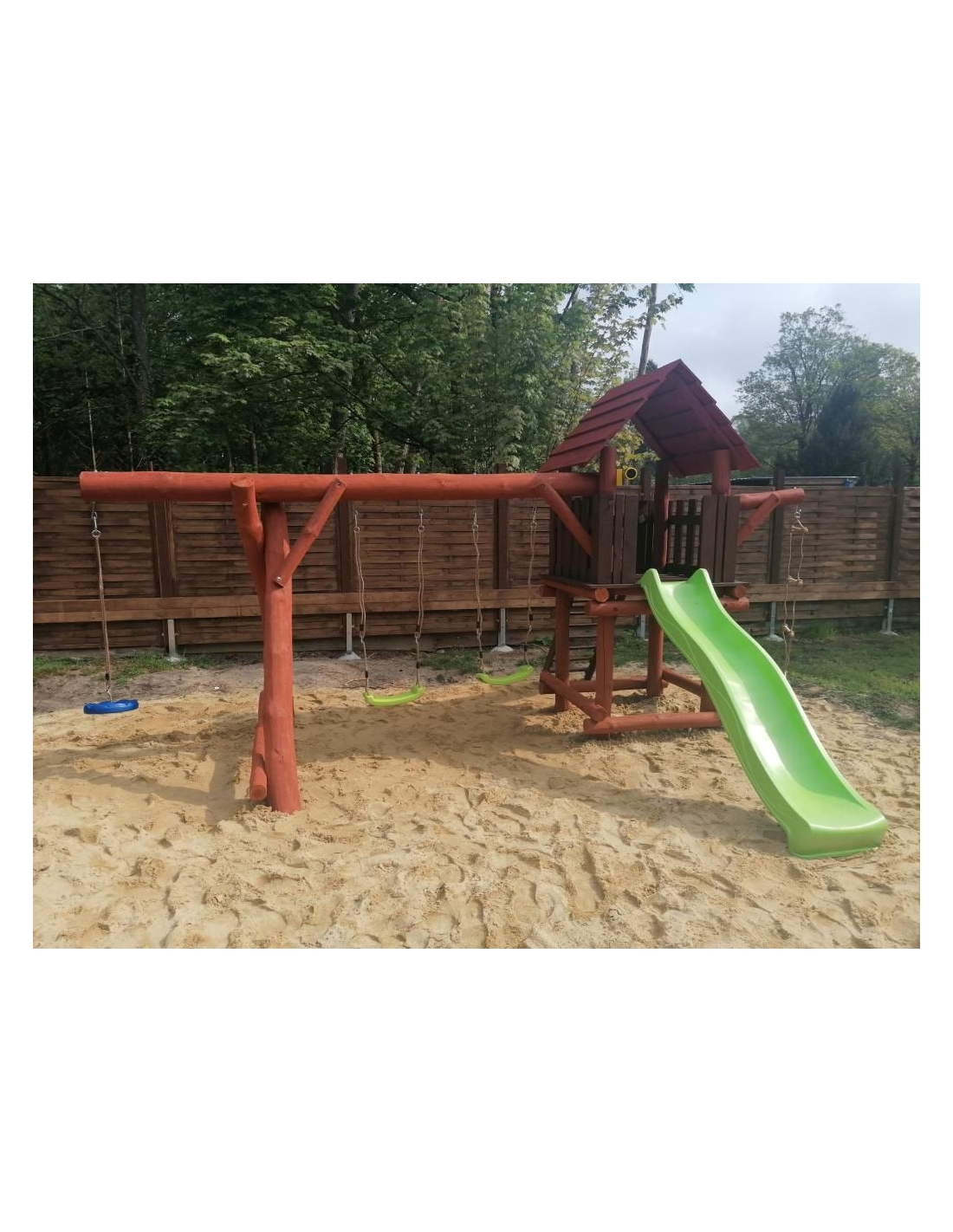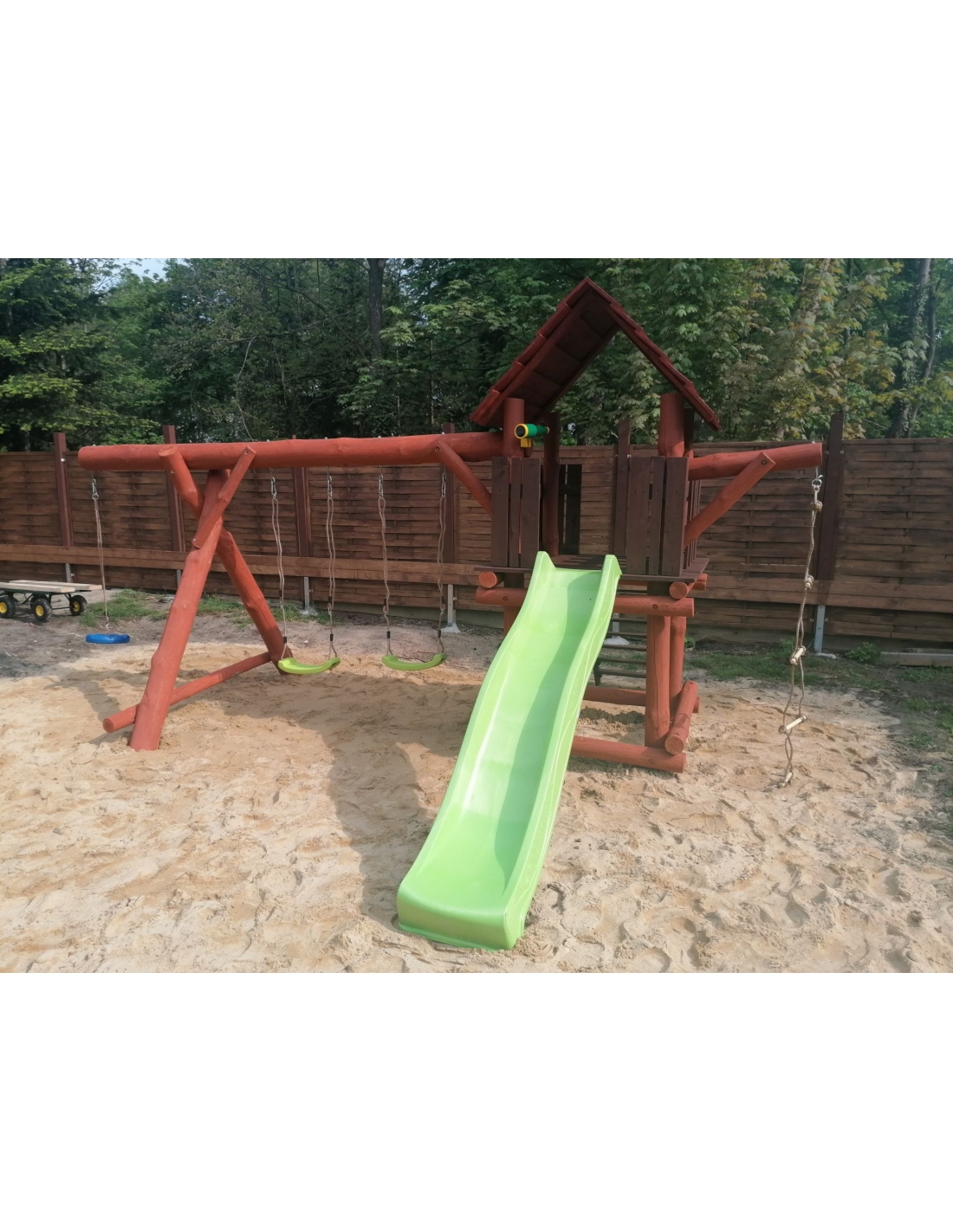 - (LxBxH): 500 cm x 400 cm x 290 cm - (Die Gesamtabmessungen können eine Toleranz von etwa 20–30 cm aufweisen. Die Maße hängen von der Dicke der Balken ab, aus denen wir die Spieltürme herstellen. Die Balken haben eine natürliche, unregelmäßige Form)