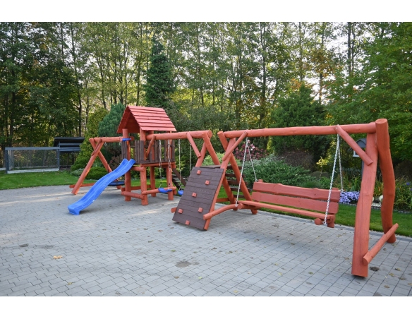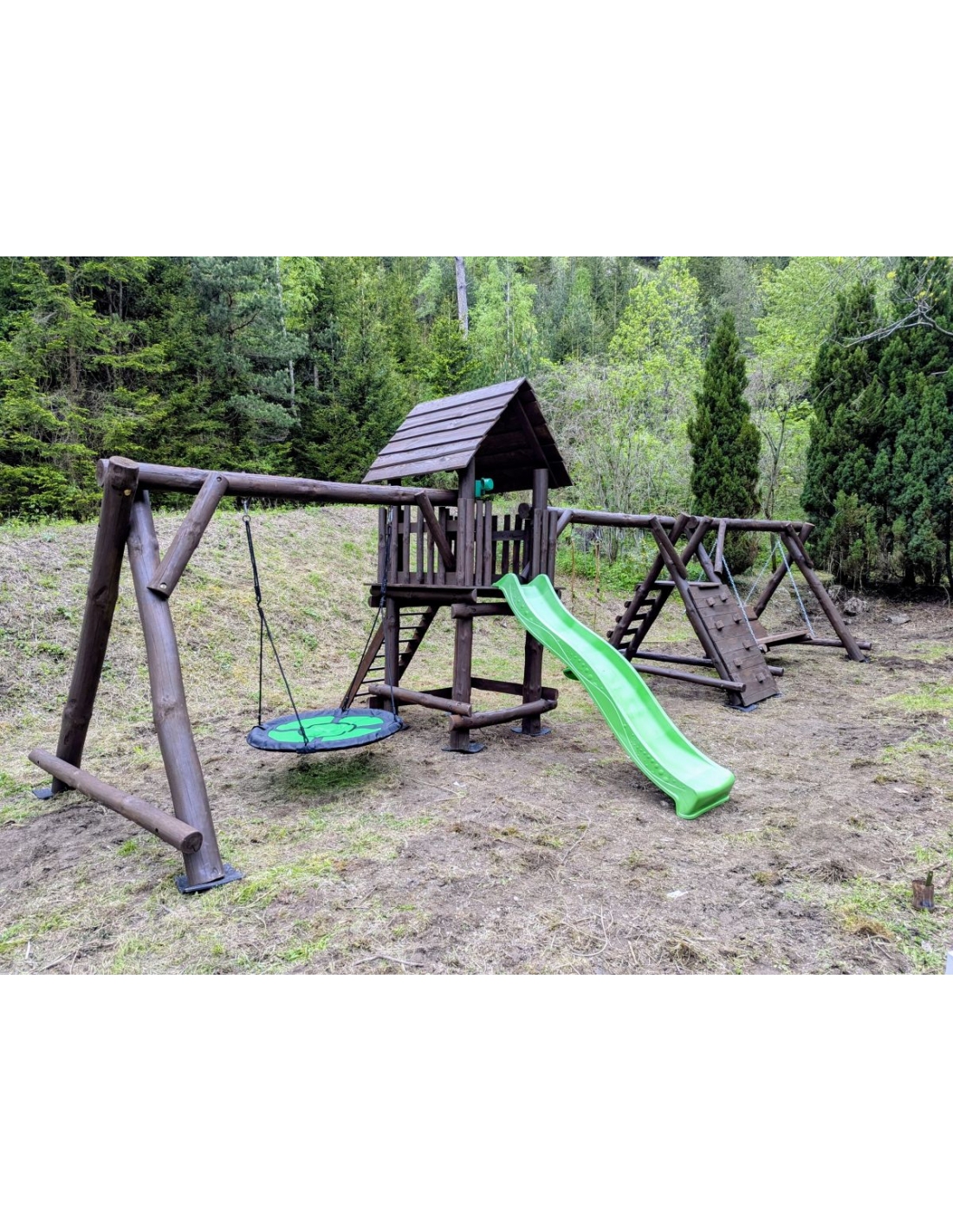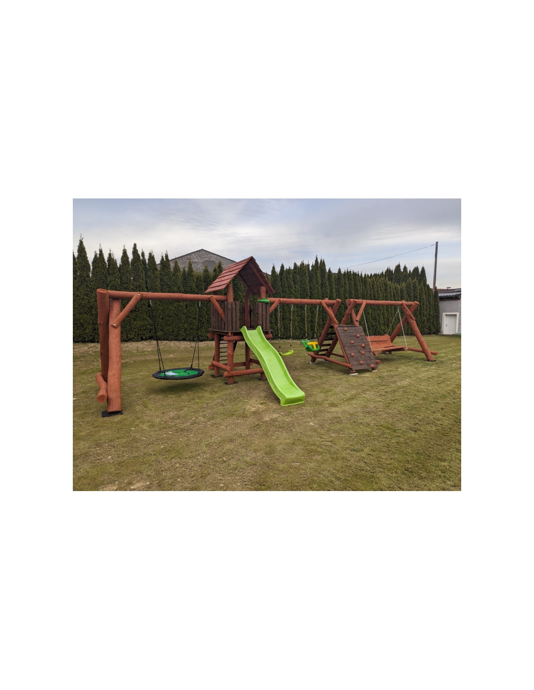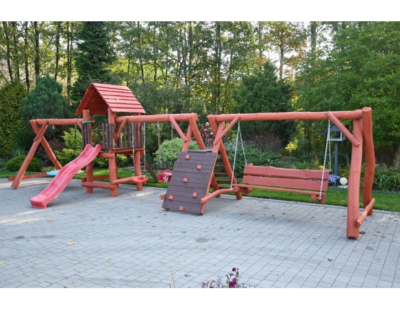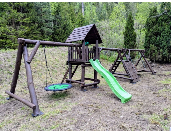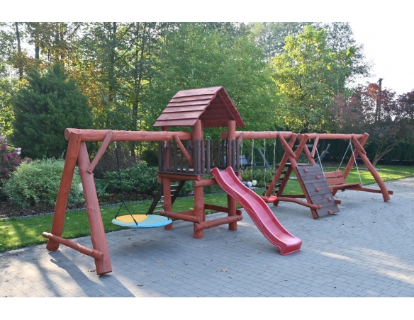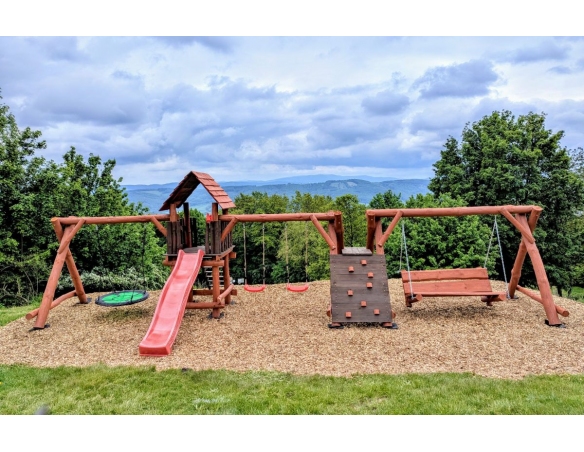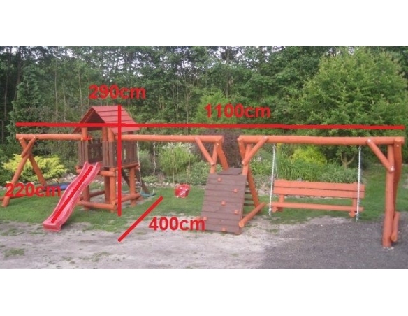 - (LxBxH): 1050cm x 400cm x 290 cm (Die Gesamtabmessungen können eine Toleranz von etwa 20–30 cm aufweisen. Die Maße hängen von der Dicke der Balken ab, aus denen wir die Spieltürme herstellen. Die Balken haben eine natürliche, unregelmäßige Form)