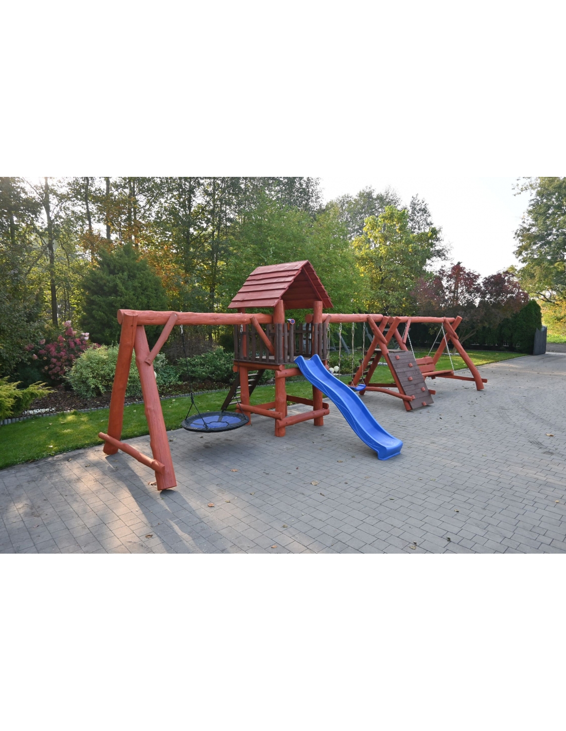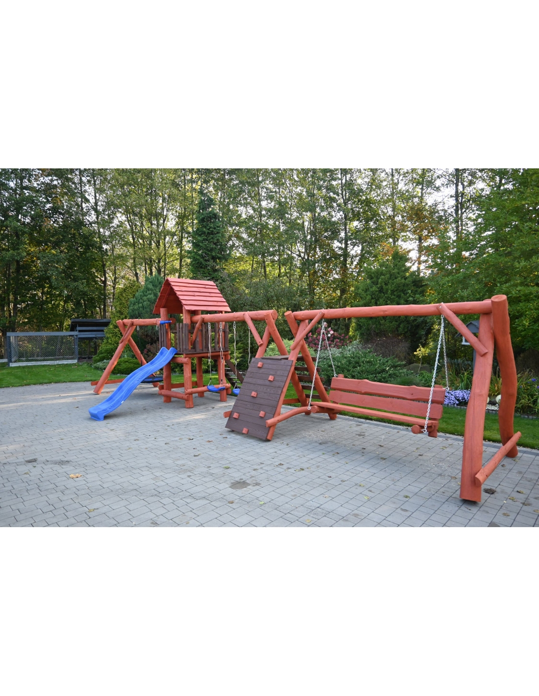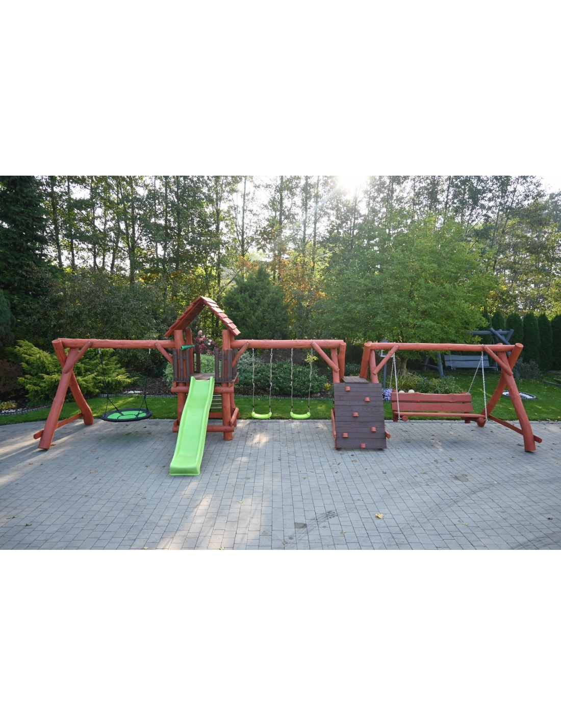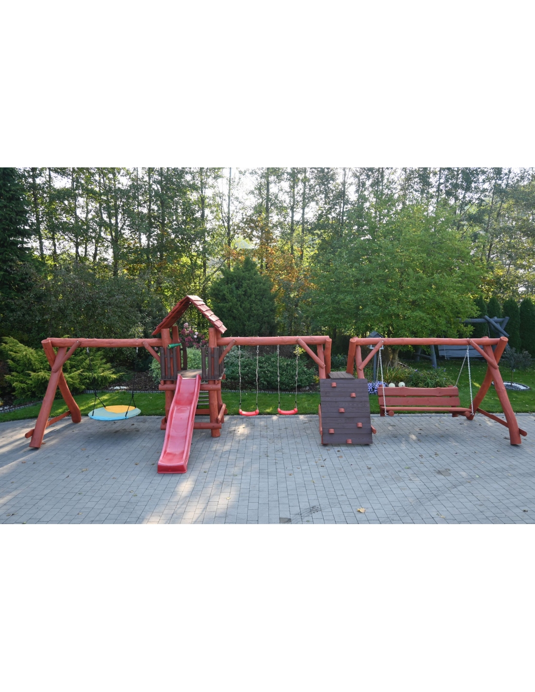 - (LxBxH): 1050cm x 400cm x 290 cm (Die Gesamtabmessungen können eine Toleranz von etwa 20–30 cm aufweisen. Die Maße hängen von der Dicke der Balken ab, aus denen wir die Spieltürme herstellen. Die Balken haben eine natürliche, unregelmäßige Form)