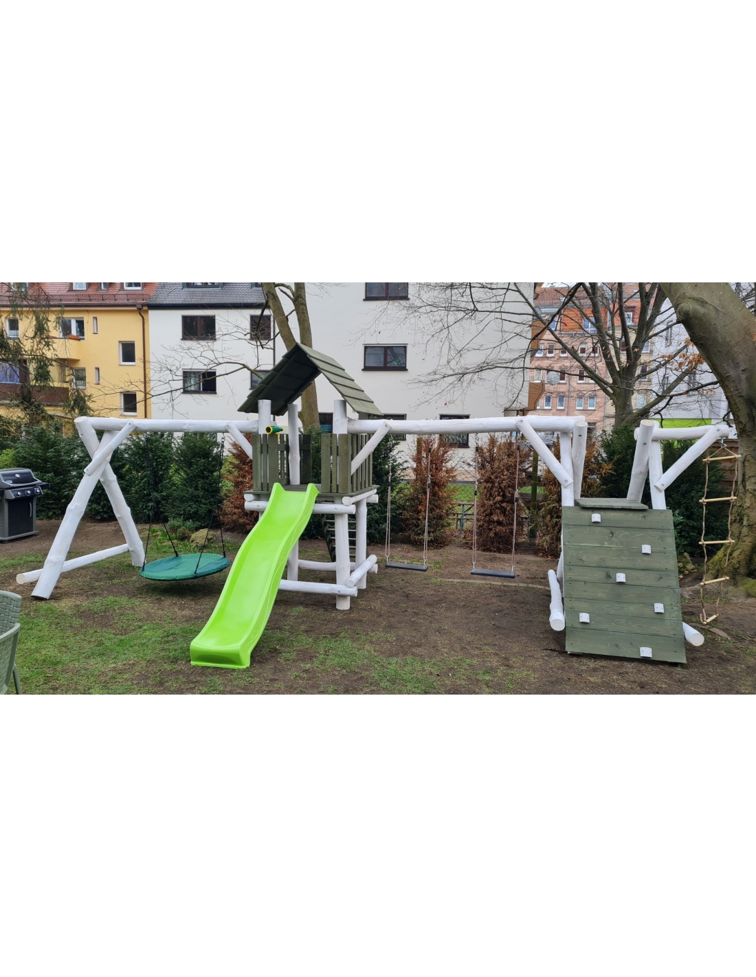 * Einige Spielturm-Sets können wir auf Wunsch anpassen. Zum Beispiel können die Position des Turms oder der Rutsche (linke oder rechte Seite) vertauscht werden, sodass der Spielturm spiegelverkehrt im Vergleich zum Angebot ausgeführt wird.