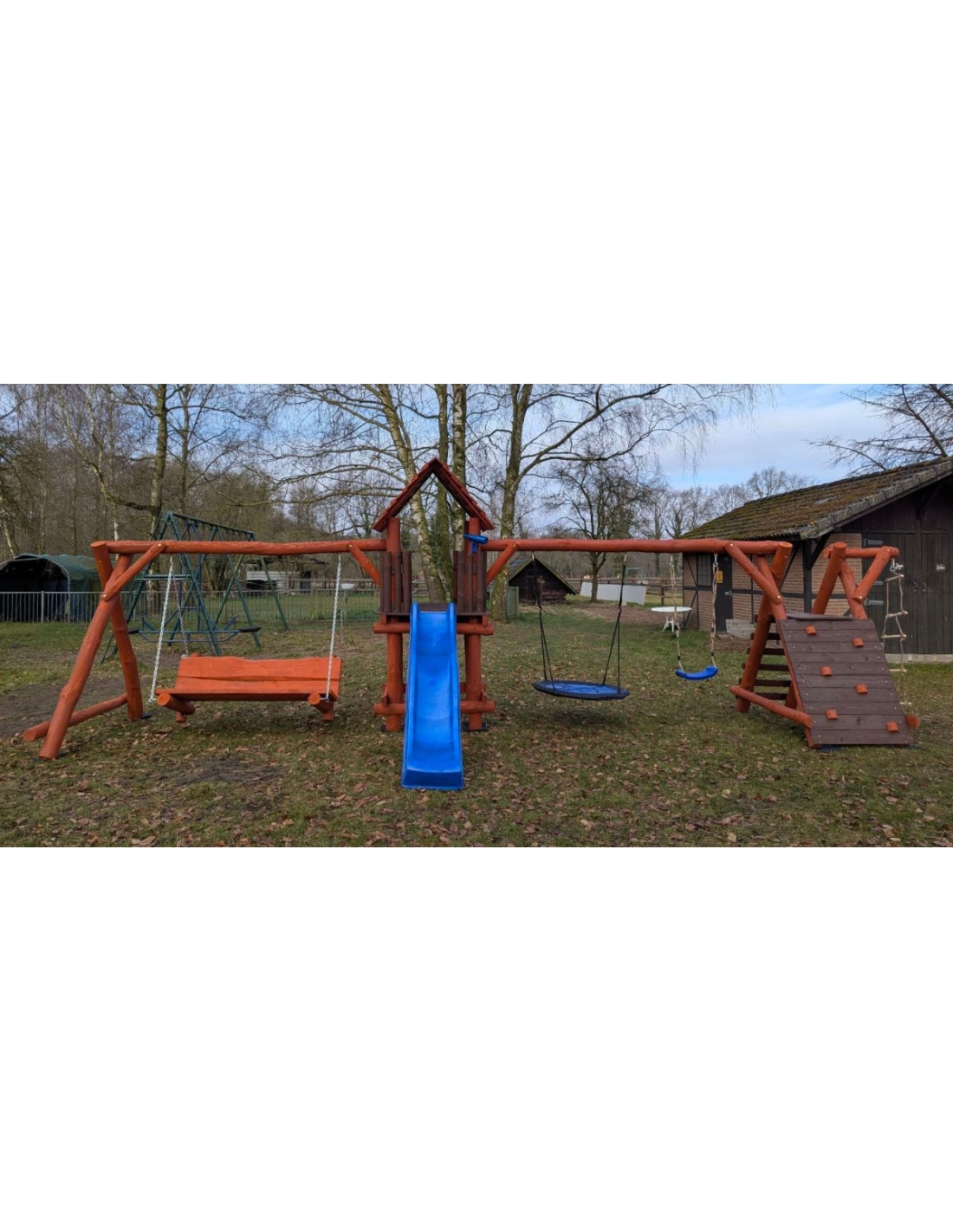 - (LxBxH): 850cm x 400cm x 290 cm (Die Gesamtabmessungen können eine Toleranz von etwa 20–30 cm aufweisen. Die Maße hängen von der Dicke der Balken ab, aus denen wir die Spieltürme herstellen. Die Balken haben eine natürliche, unregelmäßige Form)