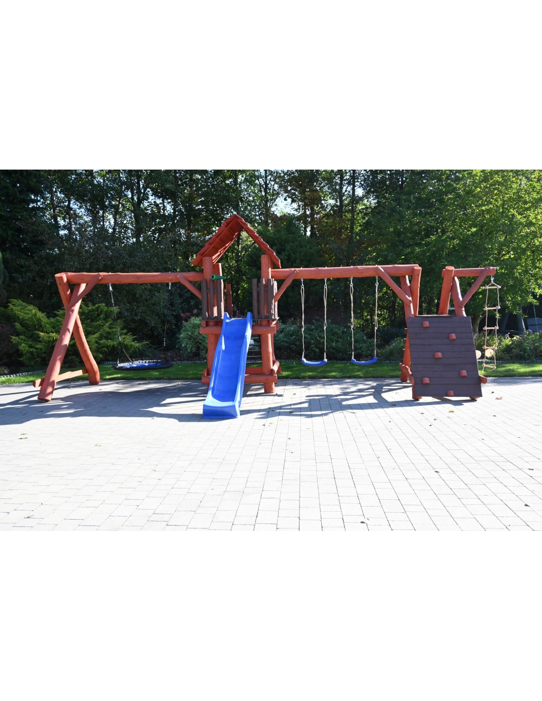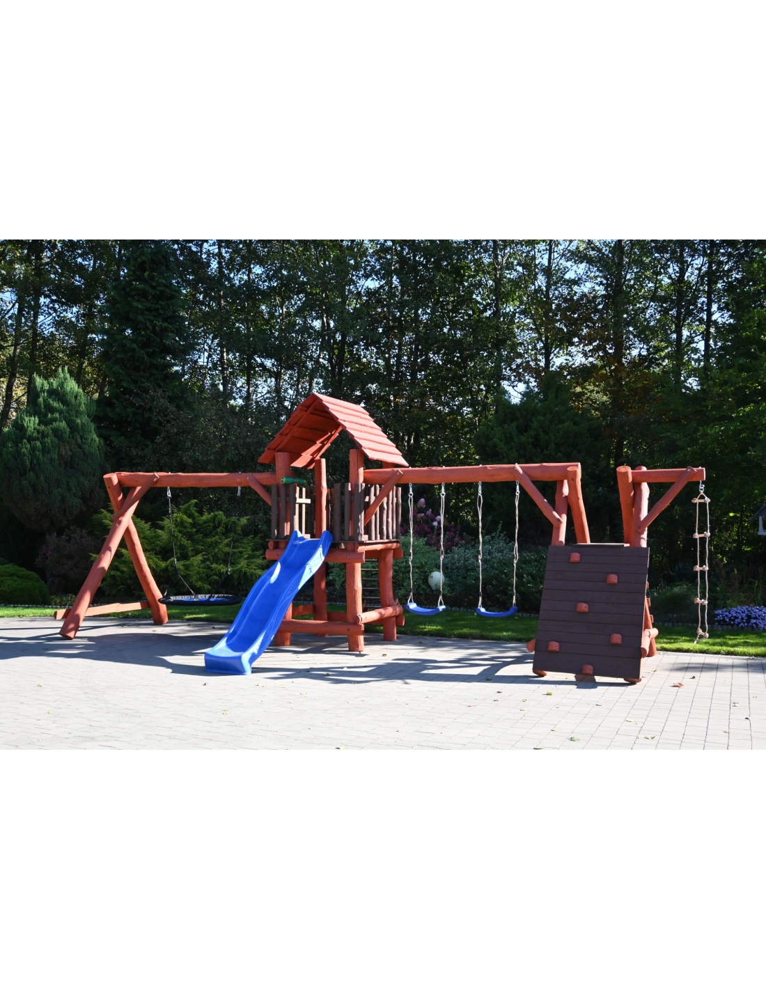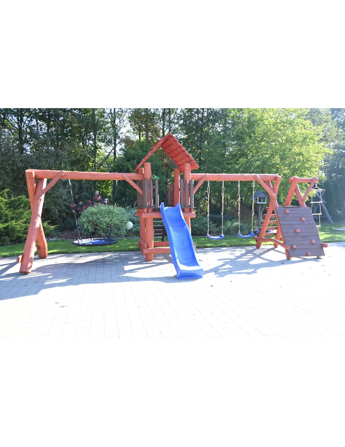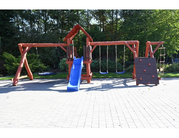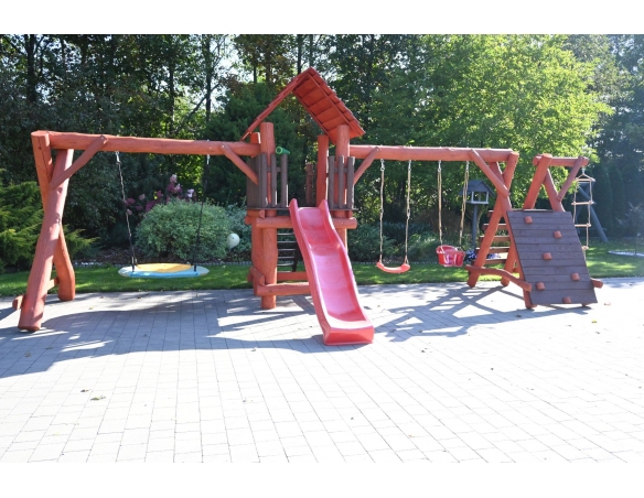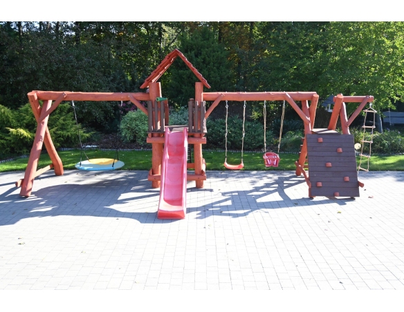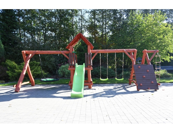 - (LxBxH): 750 cm x 400 cm x 220 cm (Die Gesamtabmessungen können eine Toleranz von etwa 20–30 cm aufweisen. Die Maße hängen von der Dicke der Balken ab, aus denen wir die Spieltürme herstellen. Die Balken haben eine natürliche, unregelmäßige Form)