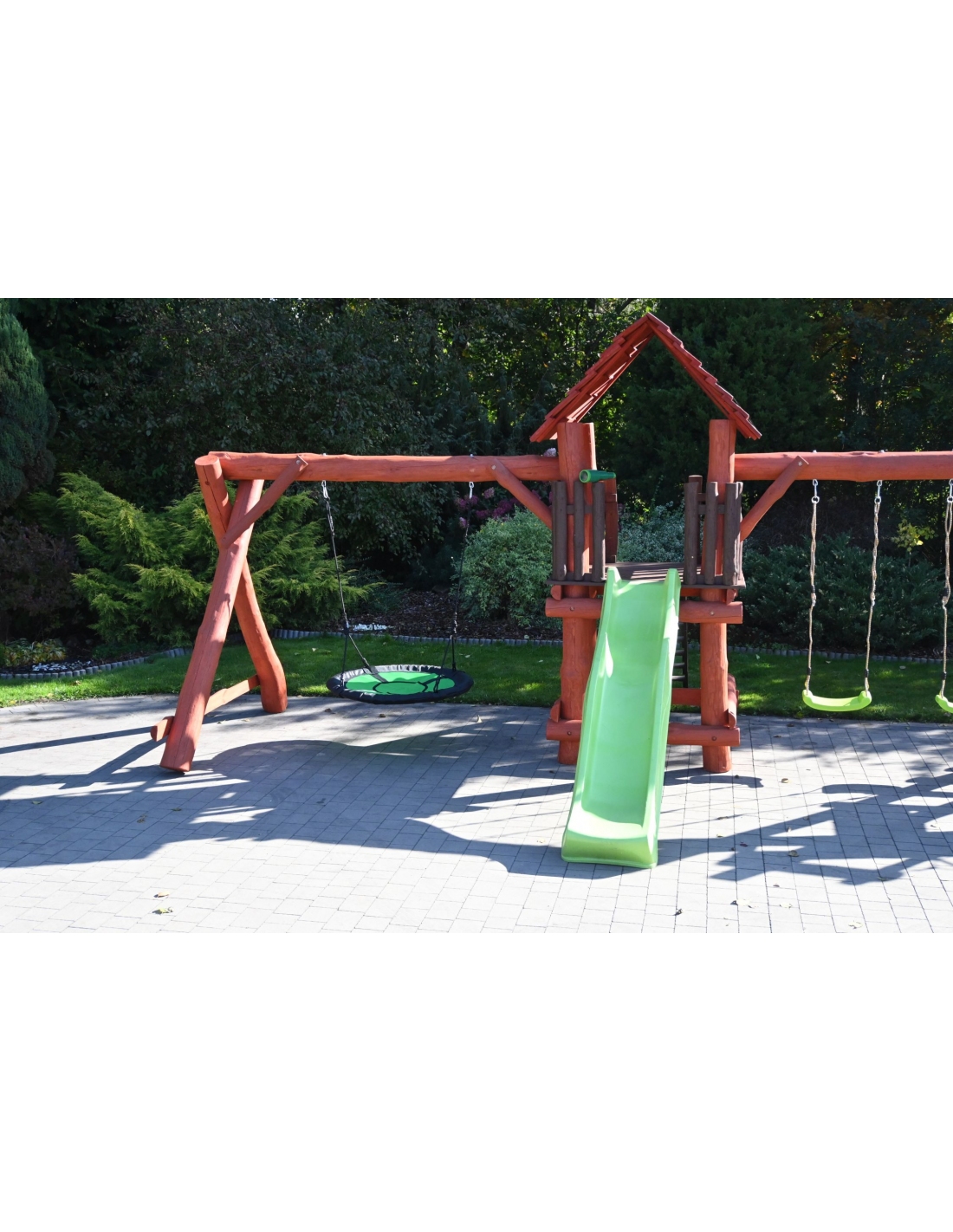 Unsere Spieltürme mit Holzhäuschen werden in einem Stück geliefert, wiegen etwa 200 kg und benötigen einen Durchgang von mindestens ca. 135 cm Breite (z. B. Gartentor, Zaun, Weg). -
