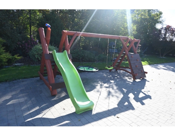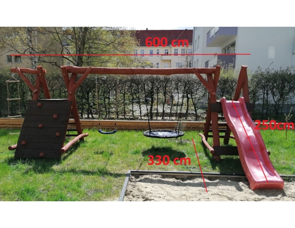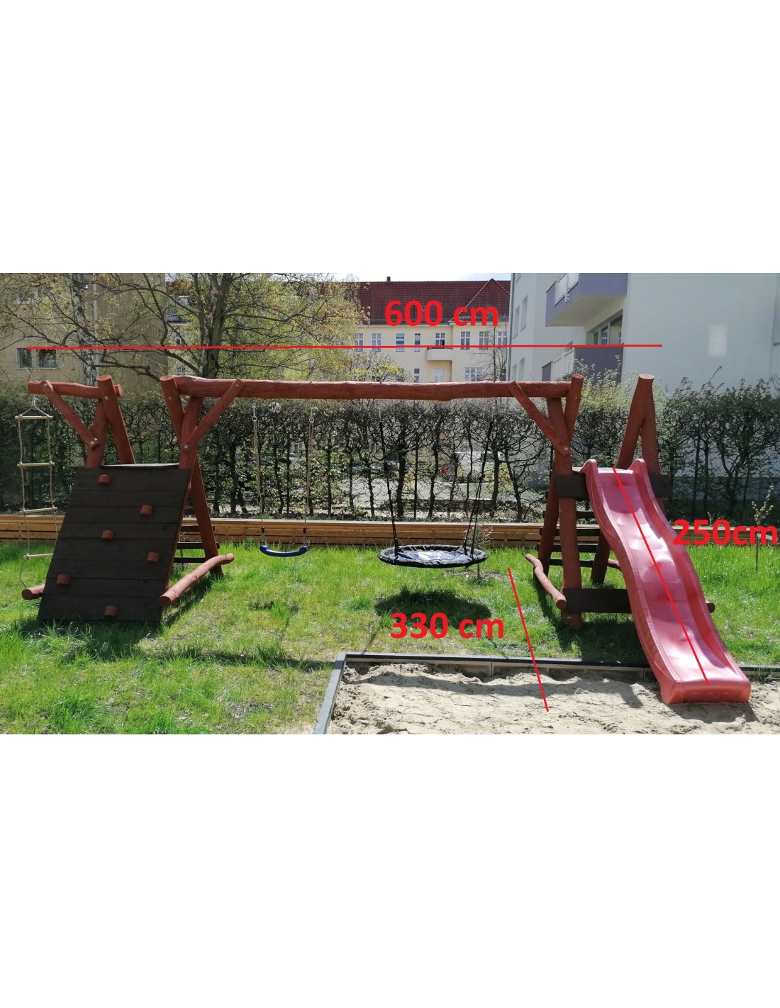 - (LxBxH): 600 cm x 330 cm x 220 cm (Die Gesamtabmessungen können eine Toleranz von etwa 20–30 cm aufweisen. Die Maße hängen von der Dicke der Balken ab, aus denen wir die Spieltürme herstellen. Die Balken haben eine natürliche, unregelmäßige Form)