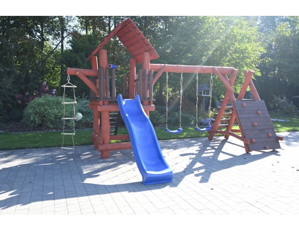 - (LxBxH): 540 cm x 400 cm x 290 cm (Die Gesamtabmessungen können eine Toleranz von etwa 20–30 cm aufweisen. Die Maße hängen von der Dicke der Balken ab, aus denen wir die Spieltürme herstellen. Die Balken haben eine natürliche, unregelmäßige Form)