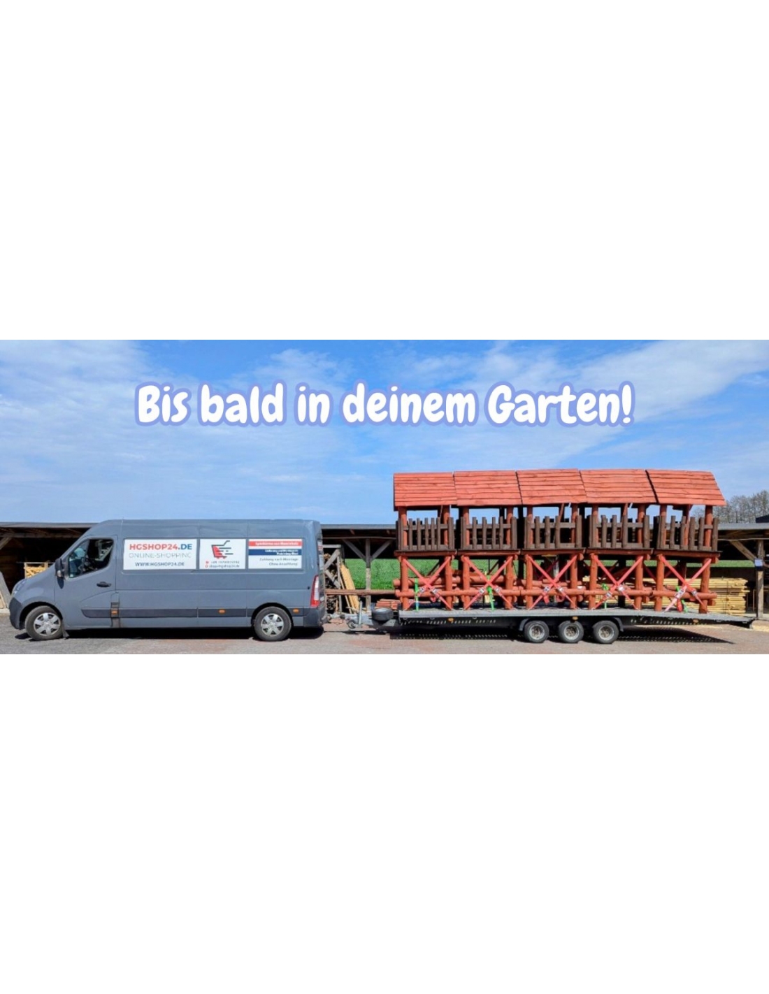 Unsere Spieltürme mit Holzhäuschen werden in einem Stück geliefert, wiegen etwa 200 kg und benötigen einen Durchgang von mindestens ca. 135 cm Breite (z. B. Gartentor, Zaun, Weg). -