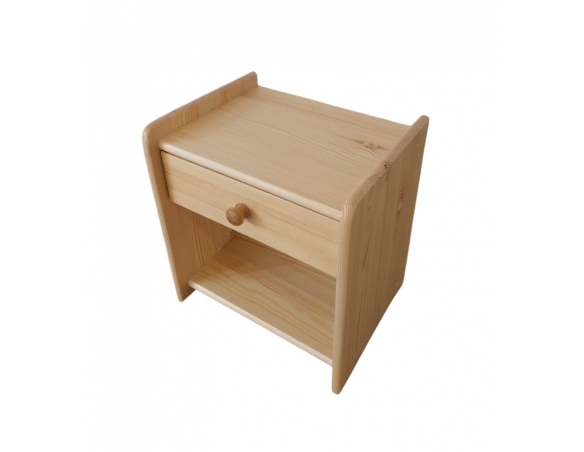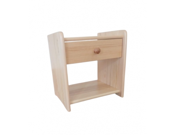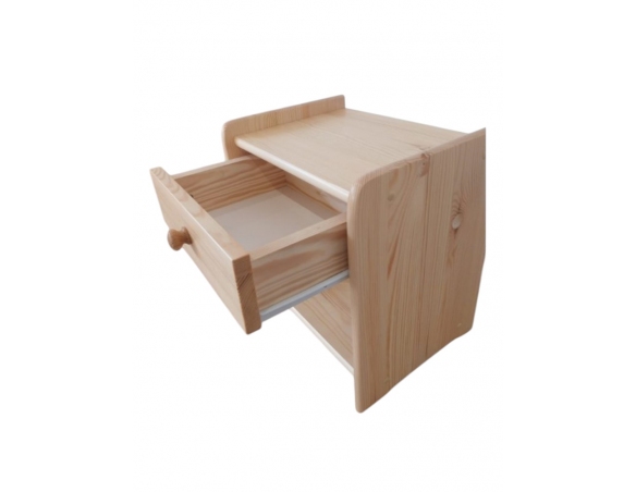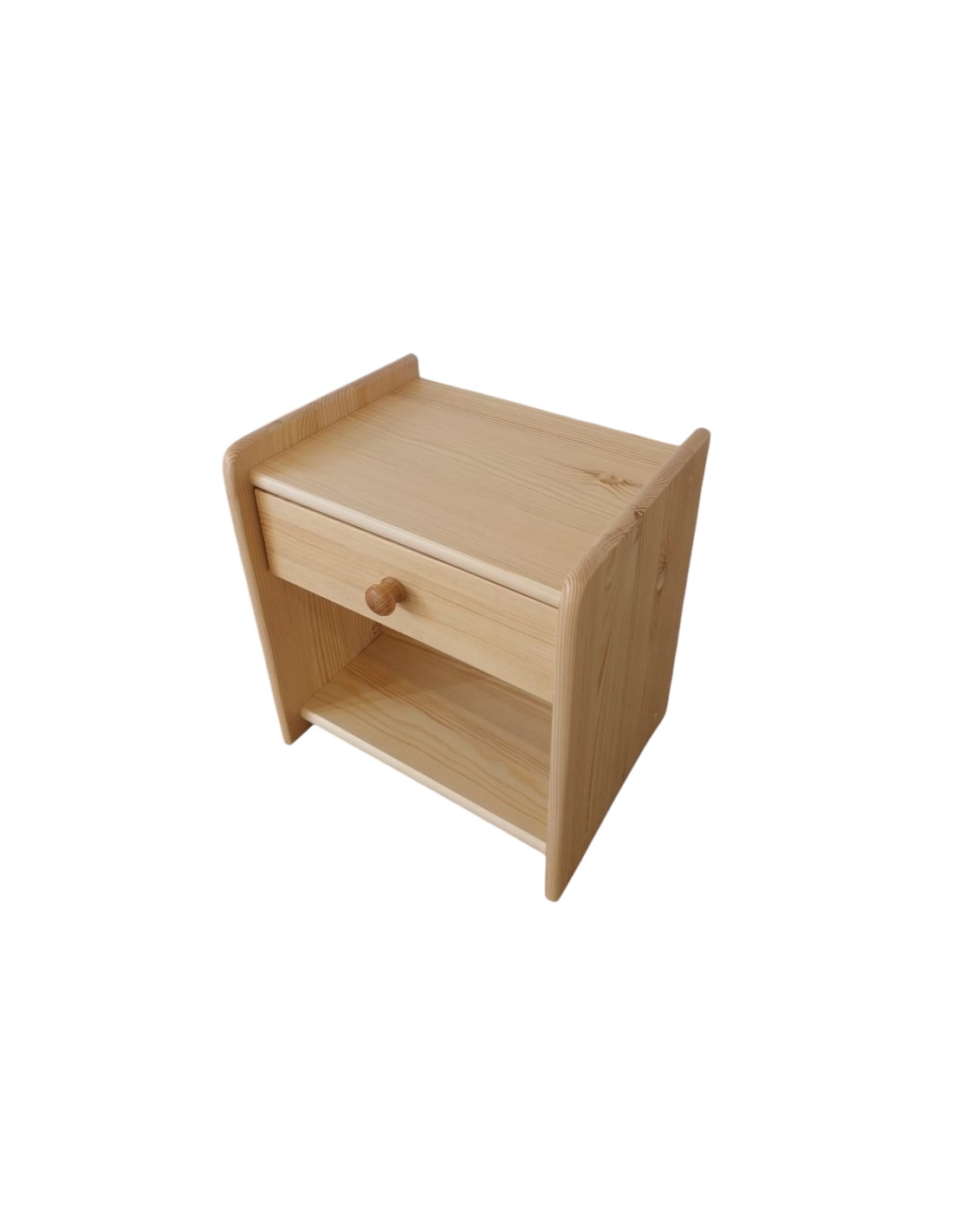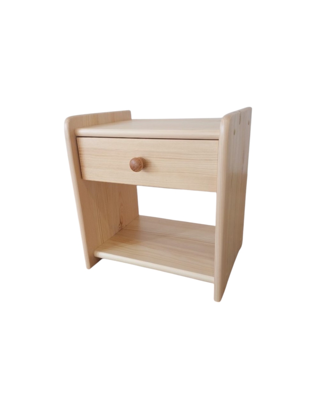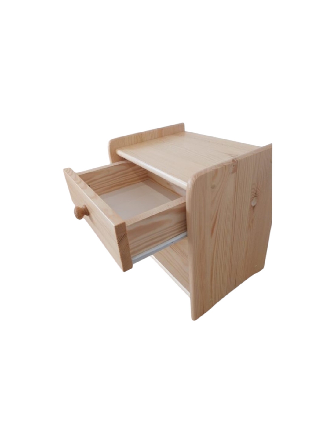 Der Nachtschrank ist aus massivem Kiefernholz mit einer Stärke von 20 mm gefertigt. Der Schrank hat eine Schublade und zwei Regale, die dafür sorgen, dass wichtige Dinge wie eine Nachttischlampe, ein Buch, ein Telefon oder ein Glas Wasser immer in greifbarer Nähe sind. Die Möbel sind mit einem transparenten, seidenmatten Lack überzogen. Der verwendete Lack erfüllt die Anforderungen der Norm EN71-3, die für die Herstellung von Kindermöbeln erforderlich ist. Die Schublade auf Rollenleitern, Boden aus HDF-Platte mit einer Dicke von 3 mm. Die Kanten des Nachttisches wurden abgerundet. Der Nachttisch fügt sich perfekt in jede Einrichtung ein, besonders im Schlafzimmer neben dem Bett oder Schrank, oder als unverzichtbares Möbelstück in einem Hotelzimmer.