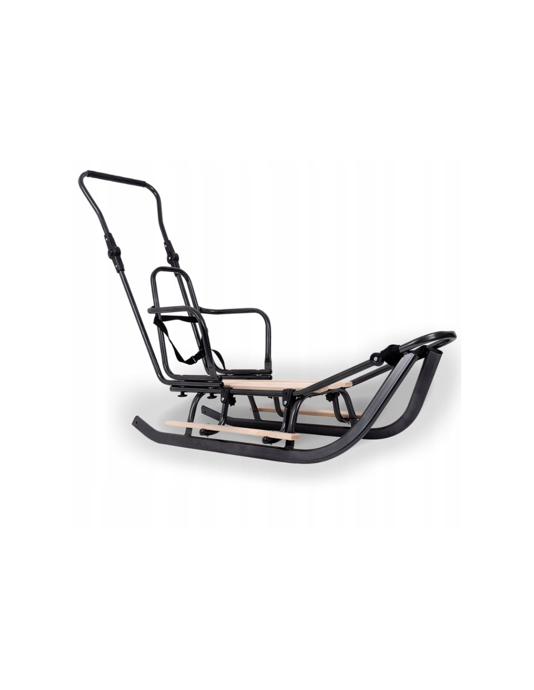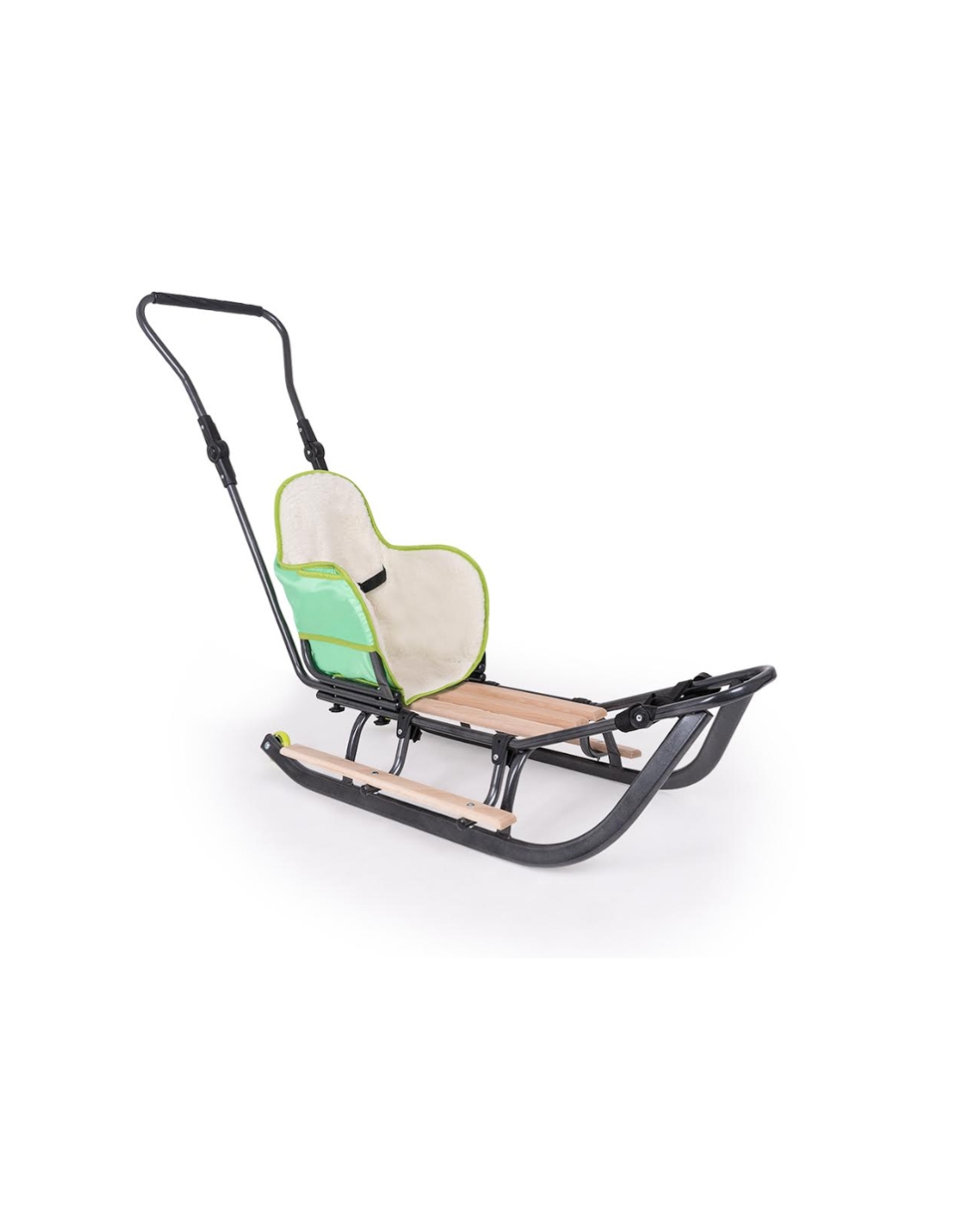 Die Rückenlehne ist mit einem Sicherheitsgurt ausgestattet, der mit einem Clip verschlossen wird. Der Schubbügel hat einen verstellbaren Griff für mehr Komfort. Nach der Demontage des zusätzlichen Zubehörs können die Schlitten weiterhin genutzt werden, wenn die Kinder größer sind.