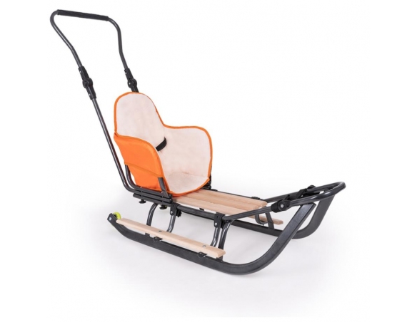 Die Rückenlehne ist mit einem Sicherheitsgurt ausgestattet, der mit einem Clip verschlossen wird. Der Schubbügel hat einen verstellbaren Griff für mehr Komfort. Nach der Demontage des zusätzlichen Zubehörs können die Schlitten weiterhin genutzt werden, wenn die Kinder größer sind.
