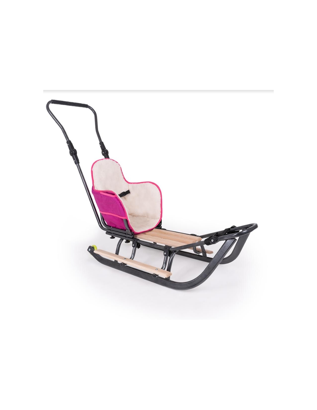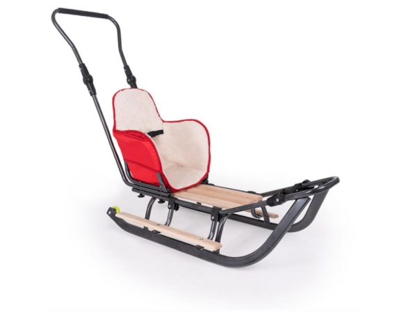 Die Rückenlehne ist mit einem Sicherheitsgurt ausgestattet, der mit einem Clip verschlossen wird. Der Schubbügel hat einen verstellbaren Griff für mehr Komfort. Nach der Demontage des zusätzlichen Zubehörs können die Schlitten weiterhin genutzt werden, wenn die Kinder größer sind.