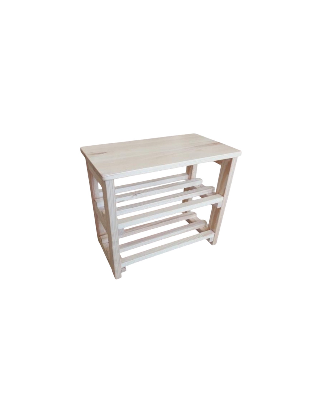 Das Schuhregal besteht aus natürlichem Kiefernholz, das mit einem klaren Lack versiegelt wurde. Dadurch behält es seine helle, natürliche Holzfarbe und die sichtbare Maserung bei, was ihm ein ästhetisches und minimalistisches Aussehen verleiht. Die Konstruktion ist stabil und robust, was eine lange Lebensdauer garantiert.
